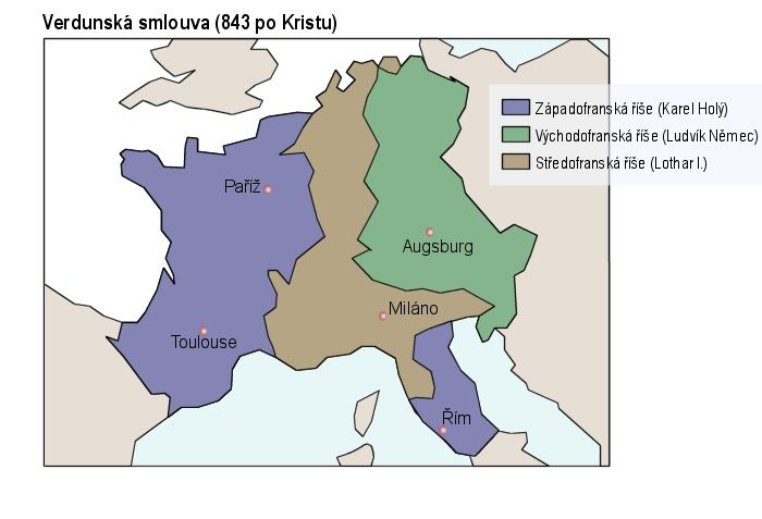 Verdunská smlouva, rozdělení Franské říše. Obr. ze stránky dějepis.com