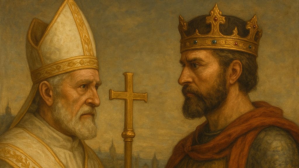 Spor začal s panováním Karla Velikého jakožto císaře říše Římské (Franská říše) papežem Lvem III. roku 800 n. l. Tento okamžik je považován za vznik daného konfliktu. Území Francké říše bylo obrovské, defacto se jednalo o téměř celou západní Evropu, patřilo zde území dnešní Francie, Německa, severní Italie, Beneluxu, západ Maďarska a sever Španělska, kde bojoval s Maury. Církev korunovala Karla Velikého pro jeho obrovský vliv v západní a střední Evropě. Čímž si zajistila ochranu, ale hlavně tím církev upevnila svoji moc. Papež Lev tvrdil, církev tě korunovala, jsi jí podřízen, jakožto vyšší moci.