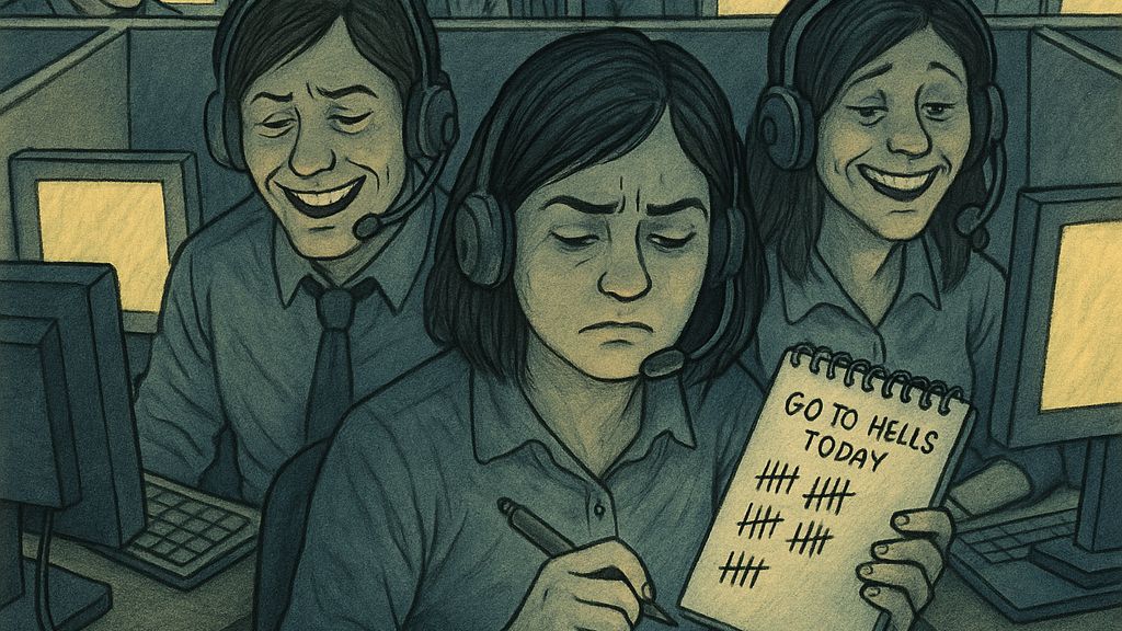 V call centru se slušnost stává zbraní. Každé „běžte do prdele“ má svůj záznam a v open space pomalu vzniká mapa pekla, kde vládne ticho, káva a absurdní lidskost.