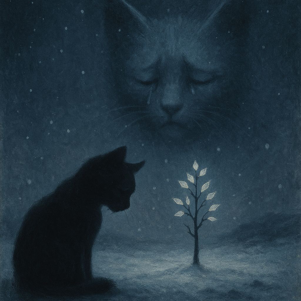 A noc zahalila svět temnotou bez hvězd, a přivedla krutý mráz, a stromek, protože nebyl plamenem, koťátka neuchránil. Ráno, když nad válkou zpustošenou zemí vyšlo šedé slunce, sedm nehybných těl leželo na studeném sněhu a mlčelo, tak tiše mlčelo.