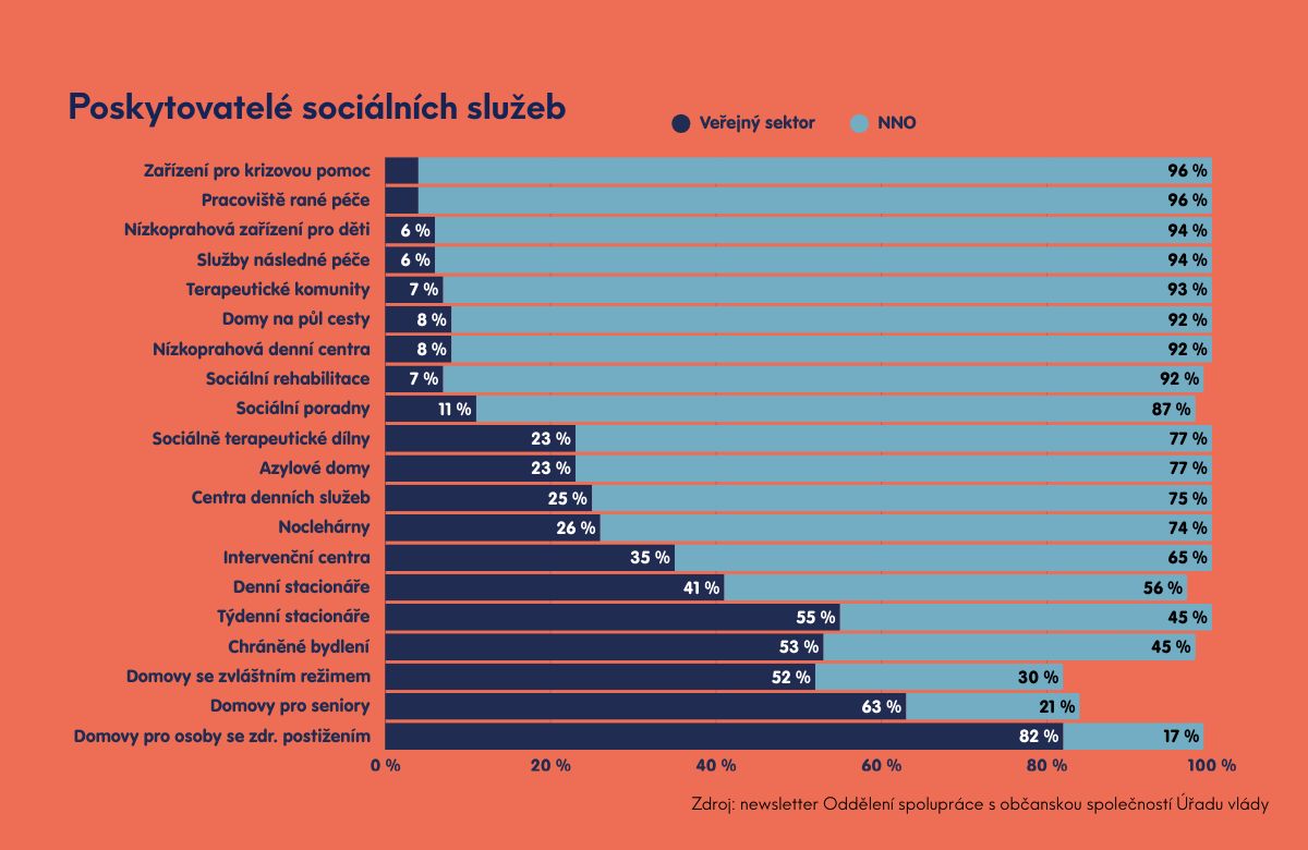 Řada oblastí není veřejným sektorem takřka vůbec zastoupená. Například více než 90 procent domů na půl cesty pro mladé odcházející z dětských domovů, osoby ohrožené sociálním vyloučením či lidi s trestní minulostí poskytují neziskové organizace. Stejně tak je tomu u zařízení pro krizovou pomoc, nízkoprahových denních center a zařízení pro děti a mládež, terapeutických komunit, sociální rehabilitace či pracovišť rané péče nebo následné péče.