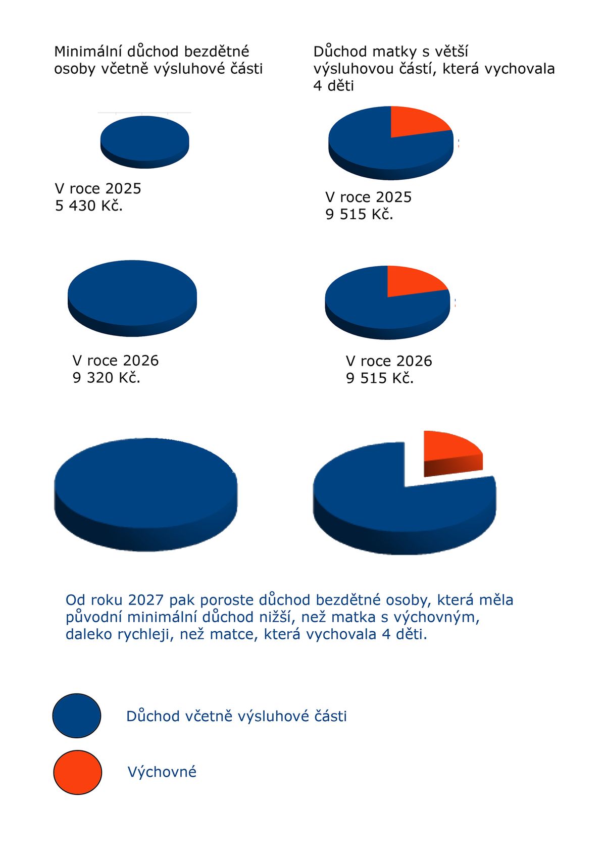 Například já – matka čtyř dětí – mám nyní důchod 9 515 Kč (včetně 2 000 Kč výchovného). Ještě letos mám i díky výsluhové části vyšší důchod než bezdětná osoba s minimálním důchodem. Od roku 2027 začnu ale kvůli valorizacím zaostávat a za pár let budu pobírat důchod hluboko pod hranicí důchodu bezdětného občana.