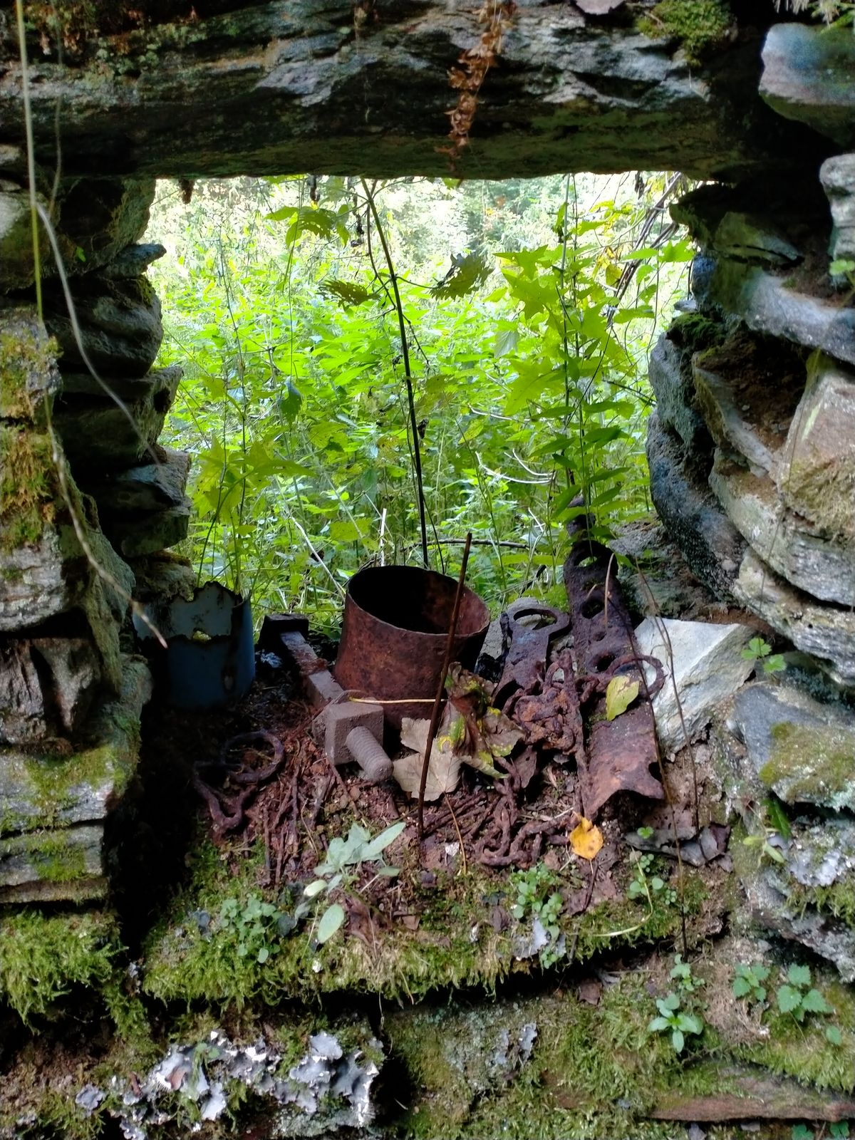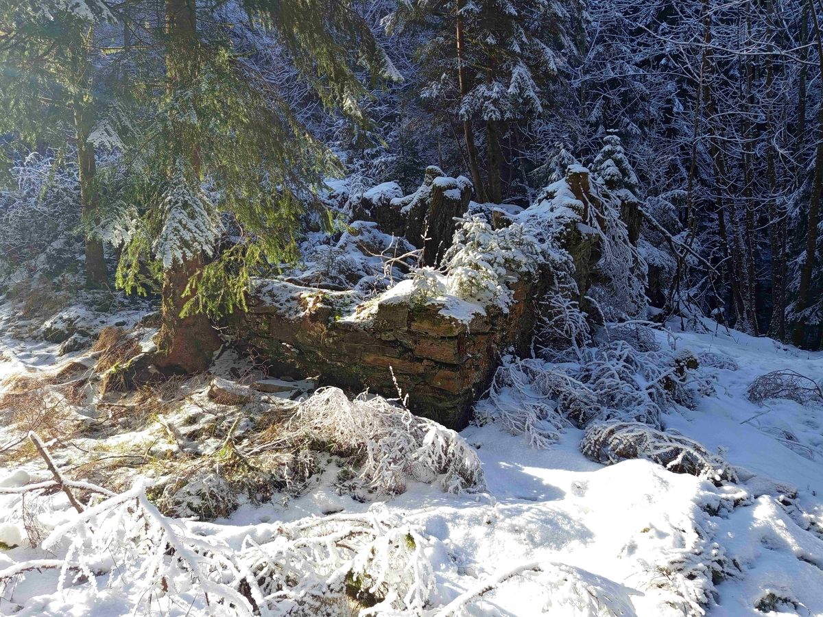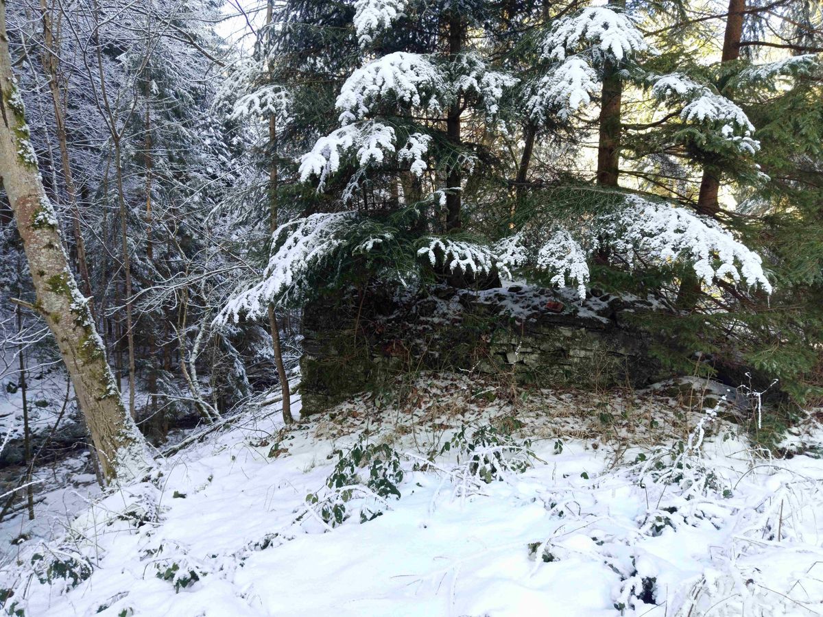 Navigace posměšně problikne a potvrdí mi, že zaniklá osada opravdu leží hned u modré turistické stezky a že si se mnou před chvíli jen na chvíli zahrála na schovávanou. Ani mě nenapadne drápat se zpátky do prudkého kopce a co nejopatrněji přelézám popadané kmeny stromů a překračuju zasněžené kameny, abych potok překonala. Prvním objektem, který se ocitne v mém zorném poli je kamenný sklípek: