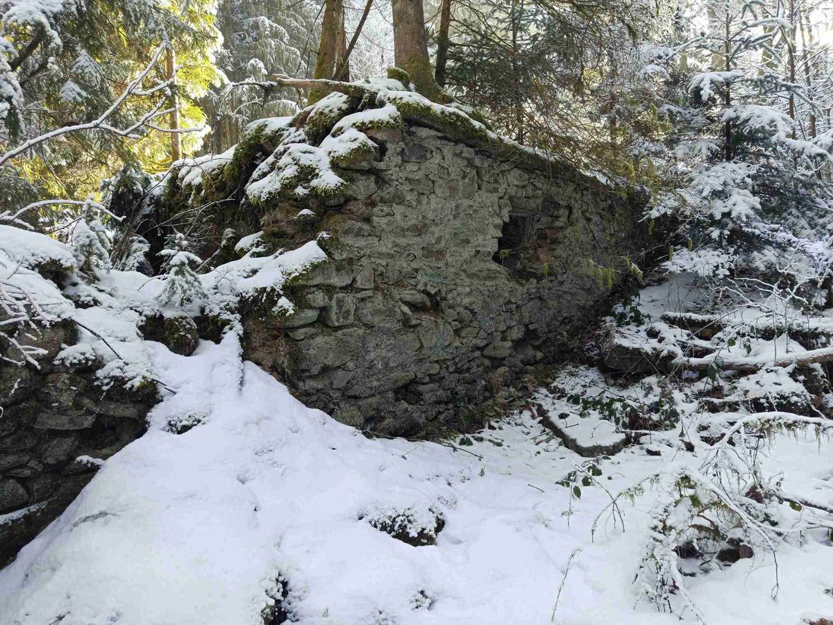 Kousek nad ním se nachází několik rozvalin, které místy díky divoké vegetaci a sněhové pokrývce téměř zcela splývají s okolím: