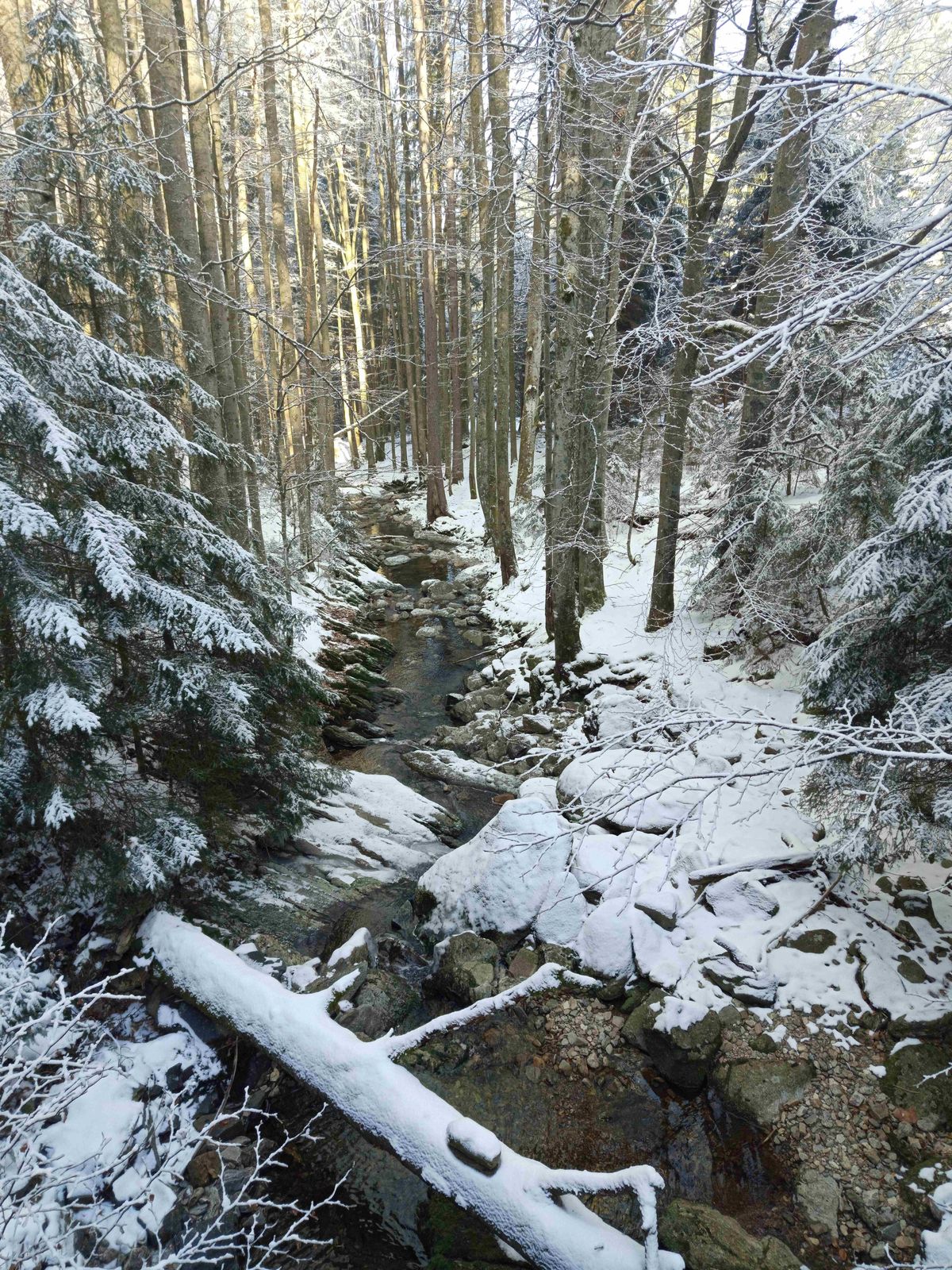 Ale stačí odsud seběhnout pár desítek metrů níž a přivítá mne hukot vodopádu Černý potok, na kterém zamrzá voda, díky čemuž vznikají roztodivné, jakoby „skleněné“ tvary: