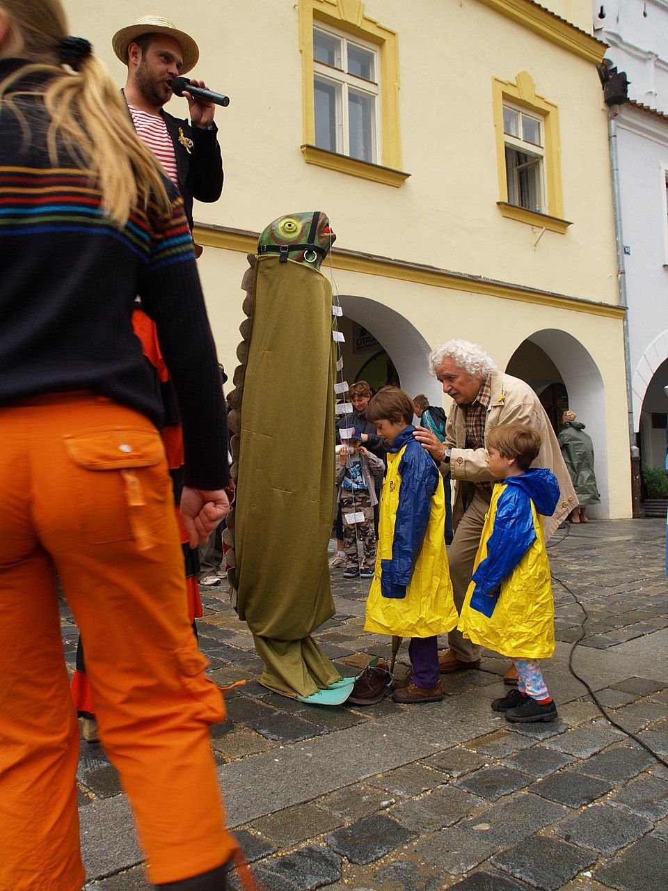 Ladislav Smoljak v Třeboni v roce 2003 přeměřuje děti cimrmetrem