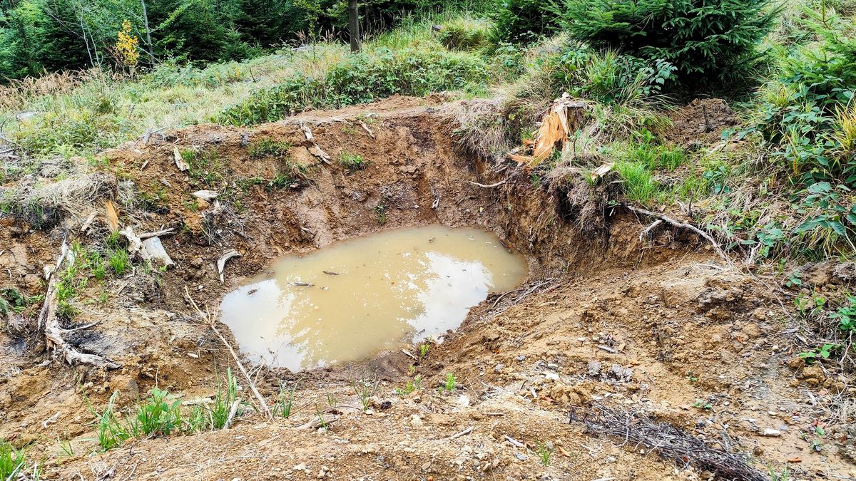 Vedle cesty pozorujeme už asi třetí obrovskou jámu plnou vody. Napadá nás — že by zadržování vody? Naše úvaha je správná a informaci mi ochotně poskytli na CHKO Beskydy.