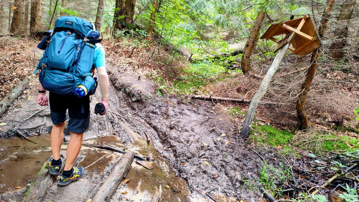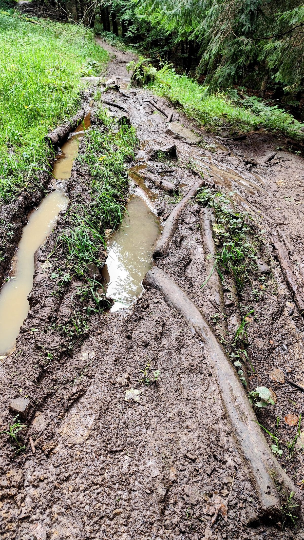 Samé bláto. Občas ho prostřídají hluboké blátivé koleje. A přes ně občas polorozpadlý chodník či dlouhé klády. Přesto mám bláto až za ušima. Nevím, jak to dělá muž, ale on i po té bahnivé štrapáci vypadá jako čerstvě vykoupané nemluvně. Já jako nezbedný puberťák — zablácené nohavice, boty a občas i cákanec na bundě. Ale hlavu si s tím nelámu.