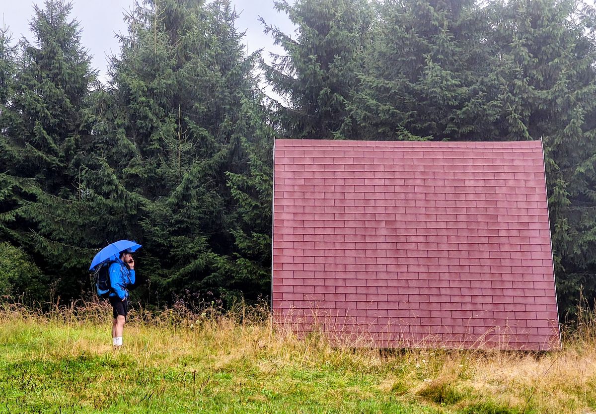 Klesáme na rozcestník Pod Velkým polomem 1 005 m n. m. Výhledy a modravé nebe si s našima očima pohrávají. Travnatá cesta se rozšiřuje, před námi se objevuje Kamenná chata. Asi jako mám chodidla, fakt jak z kamene, bolest minulých túr se vrací. Avšak věřím, že etapu dojdeme. Přeji si to.