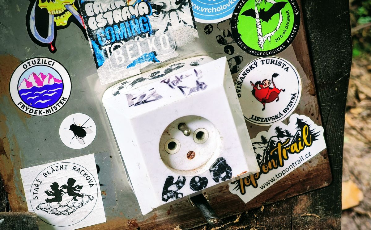 Šlapeme dál skrz blátivé koleje, přes které občas vedou dlouhé klády. Potácíme se po nich a muž si vzpomněl: „Ty sis nedala do deníku razítko Stezky v tom bufíku?“ „Hm, nedala.“ A najednou se směje: „Podívej se, to je sranda?“ A ukazuje mi u odpočívadla uprostřed lesa na trámu namontovanou elektrickou zástrčku. Veselé osvěžení!