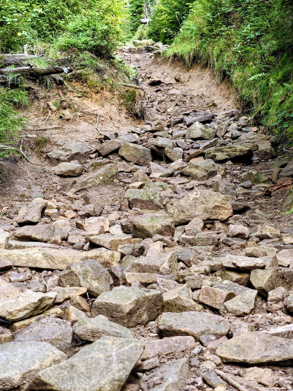 Opláštěnkované batohy jemně šustí a my si to taky šustíme pozvolna dolů po zpevněné cestě. Míříme po červené a pokračujeme dál dolů po kamenech. Větve stromů zachycují kapky, aby je po chvilce přemlouvání poslaly dál. Bubnují na kapuci jako na poplach.