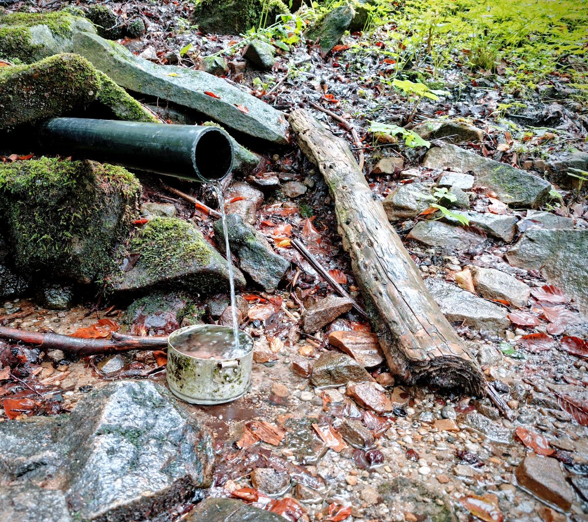 Z pod mechových kamenů vede trubka a z ní crčí pramínek vody do přistaveného ešusu. Osvěžujeme se u chladivého pramene a širokou pěšinou pokračujeme po červené dál smíšeným lesem. Kolem nás huňatá tráva.