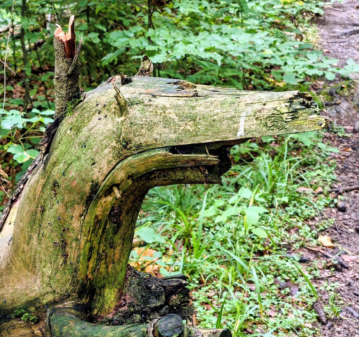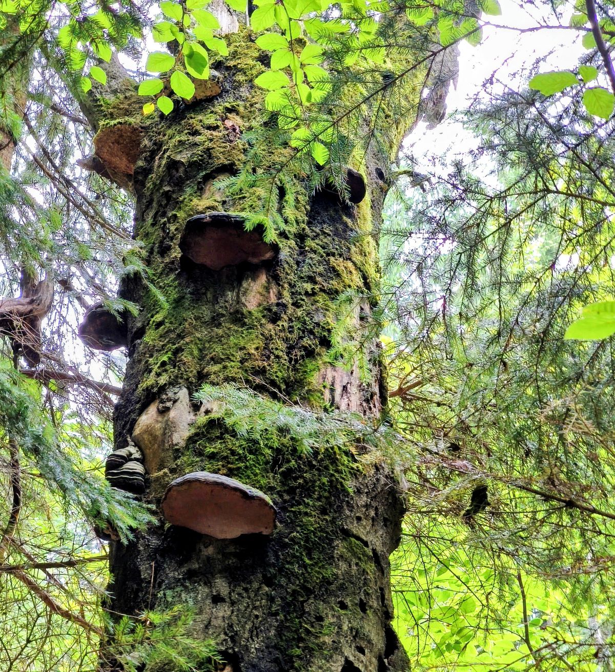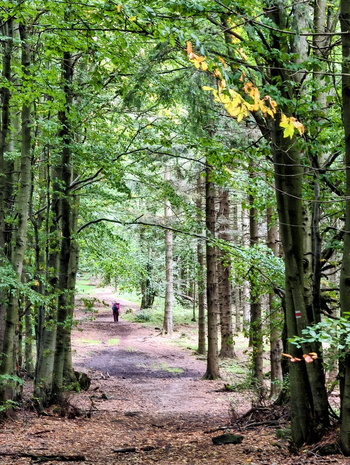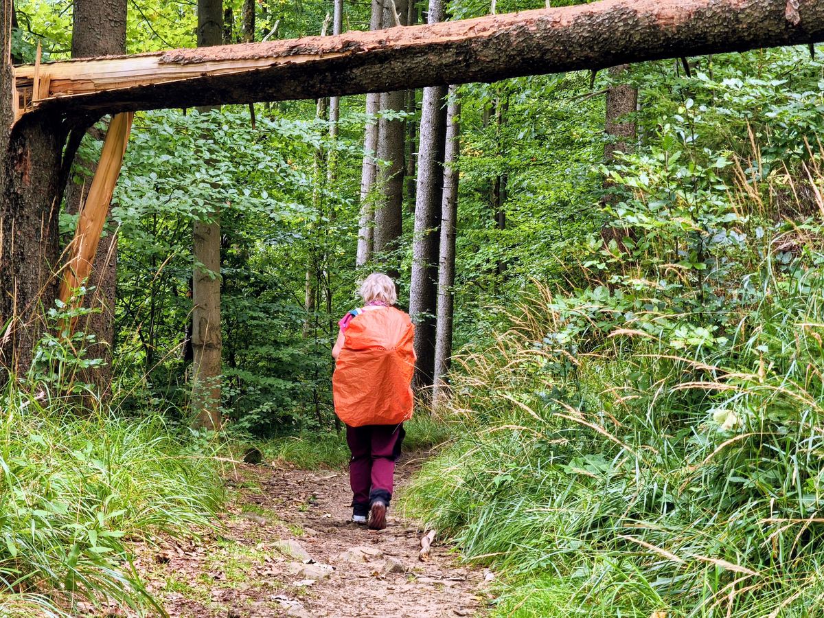 Pokračujeme do kopečka opět po cik cak hranicích. Před více než 30 lety tu hranice ještě nebyly. Ale doby se mění bez toho, co bychom si přáli. Hranice můžeme jen respektovat. Cesta nabízí opět kořenové schody a spoustu jakoby dinosaurů a klackovitých ježur. Příjemná procházka na Polom se zanedlouho zvedá sakra nahoru.