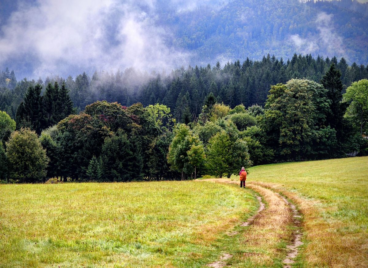 Vystoupali jsme mezi pastviny obklopené kolem dokola hustými lesy a jdeme vstříc sluníčku. Jakoby v posvátné tichosti pokračujeme přes rozhlehlé louky a připadáme si jako v údolí samoty. Sluníčko má pro nás příznivé zprávy a část oblohy zbarvila do světle modra, ale šedaví zlobři ho zase přikrývají. Nicméně pomalinku plynou, takže posléze na nás slunce zase mrkne. Počasí se mění každou chvilku.