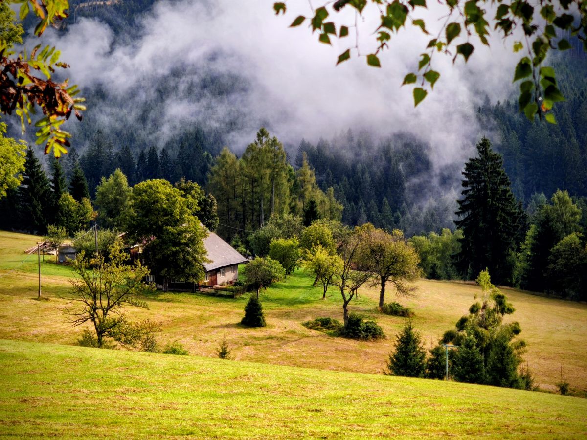 Jako by se louka deštíkem prozářila. Déšť oživil i zeleň kol kolem. Krůpěje na trávě se třpytí jako drahokamy. Jsme tu sami. Jen my a boží ticho a chaloupky bez plotů usazené v zeleni jako malé poklady. A v dáli nádherná bílá mlha zaštiťující hluboká údolí. Úplně vidím ovečky, jak se tu pasou. A ještě bych jim přidala zvonečky.