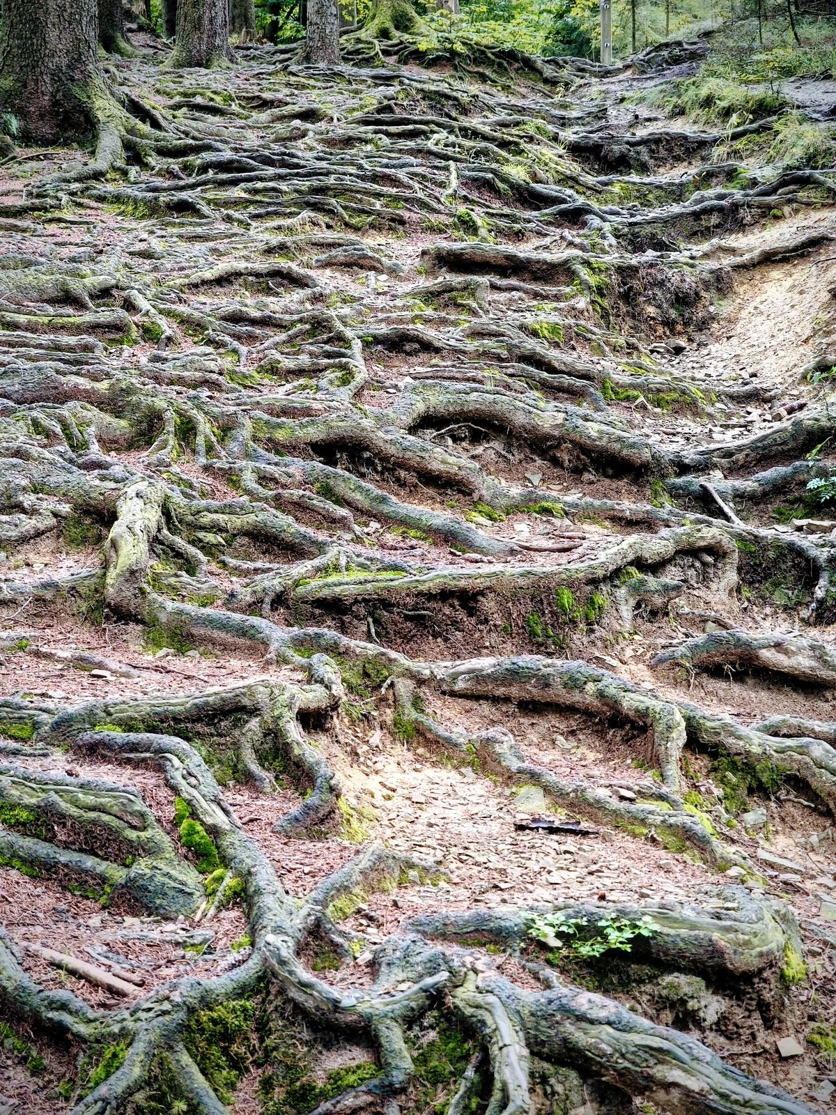 Pohádky jsme se nabažili a z kamínkové cesty odbočujeme po schodech z kořenů do další, pro tentokráte, lesní tišiny. Je zajímavé, jak kořeny dokážou opravdu udělat schody. Dokonce i udusanou hlínou vystlanými schodnicemi. S radostí nabídku přijímáme. Stoupáme a těšíme se, co nám vršek přinese.