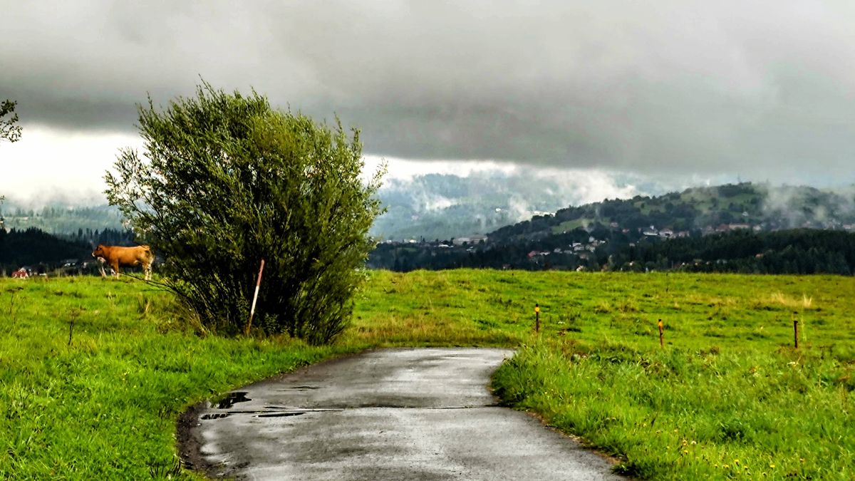 Ubíráme se po silničce vedoucí mezi rozlehlými lukami a pastvinami. Napravo se v klídku pasou kravičky, které nám vůbec nevěnují pozornost. A proč taky? Mlha se zvedá.