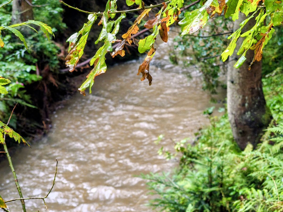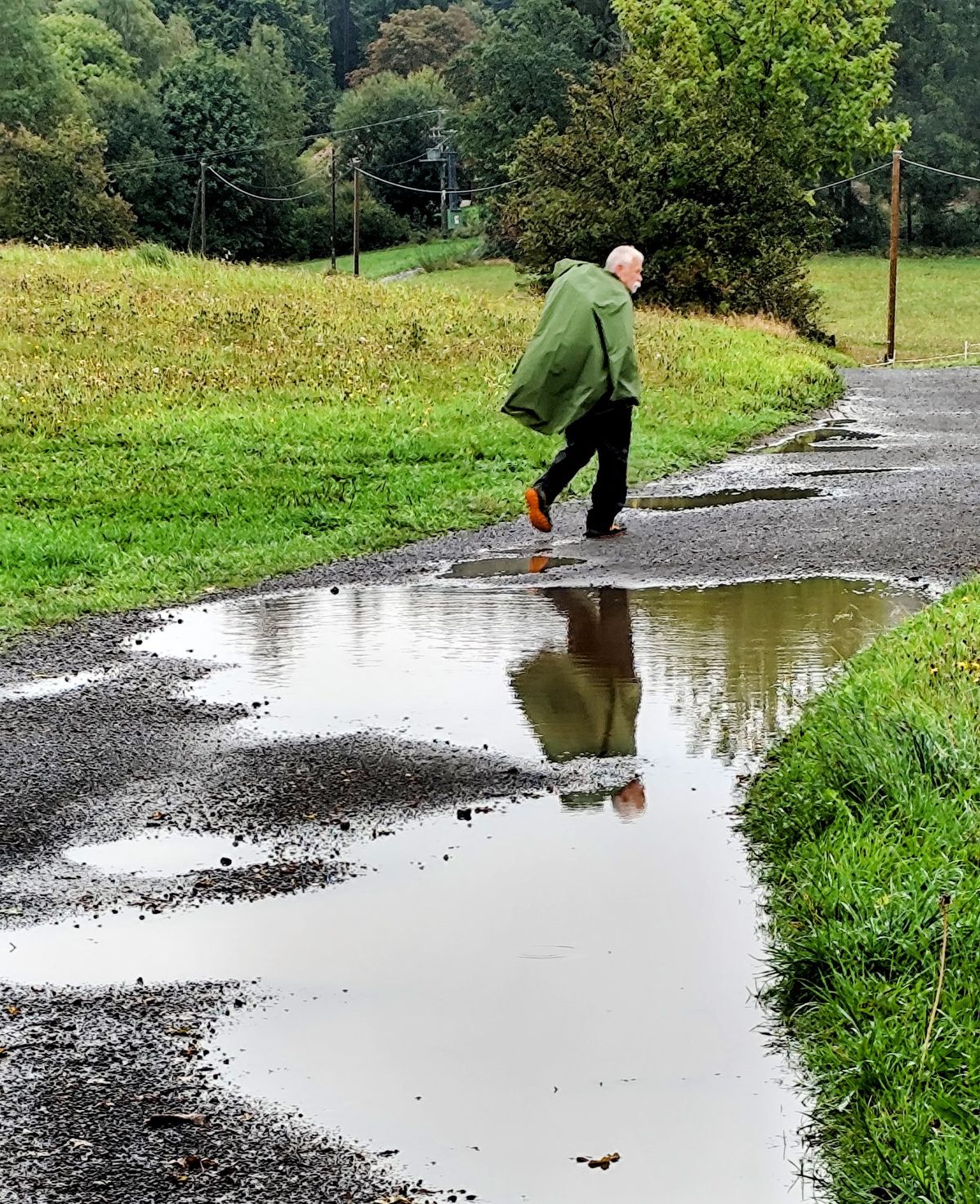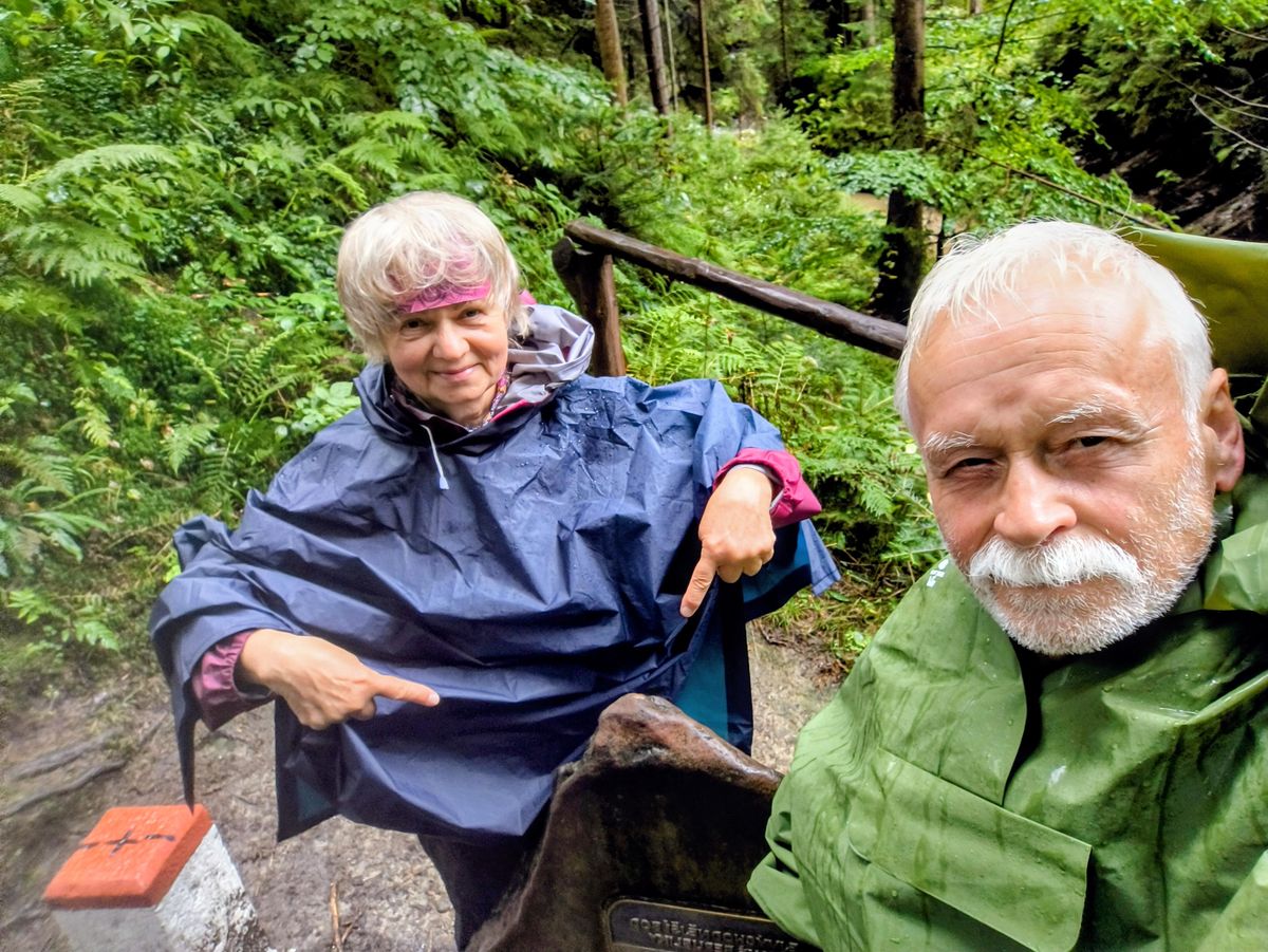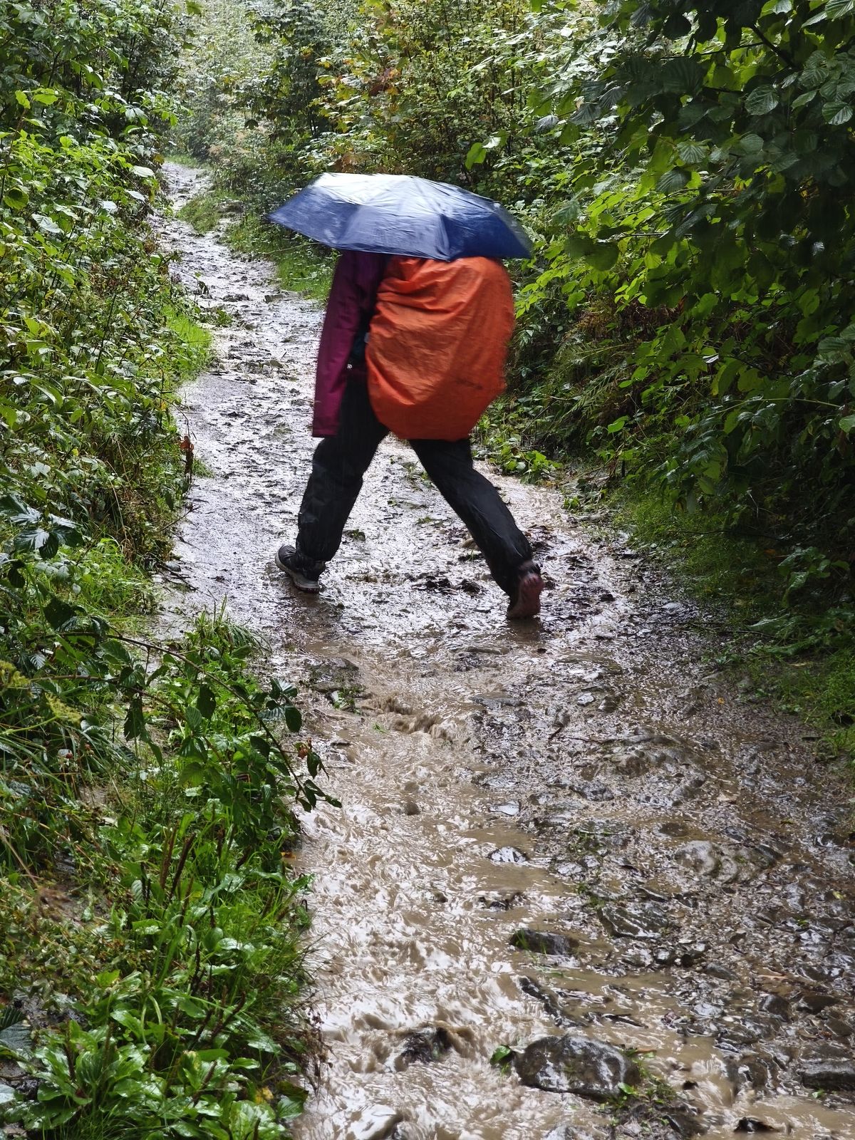 Manžel je taková moje rosnička. Podívá se za sebe: „Je úplně černo, tamhle se už něco chystá. Do 10 minut je to tady.“ Vytahujeme z pod opláštěnkovaných batohů pro jistotu deštníky. A jak řekl, stalo se. Slušná průtrž mračen. Potoky vody se valí po rozblácené cestě dolů, cachtáme místy ve vodě, nejde se tomu vyhnout.