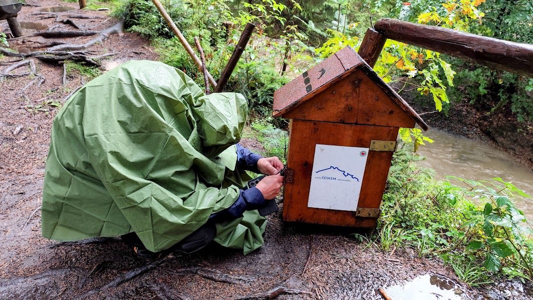 Po chvíli lomcování se nakonec zadaří a slavnostně mi podává razítko. Vlepím otisk do Stezkařského deníku, mlsneme tyčku, fotíme se, plácneme si na zdar ukončení etapy a za stálého deště opouštíme východ.