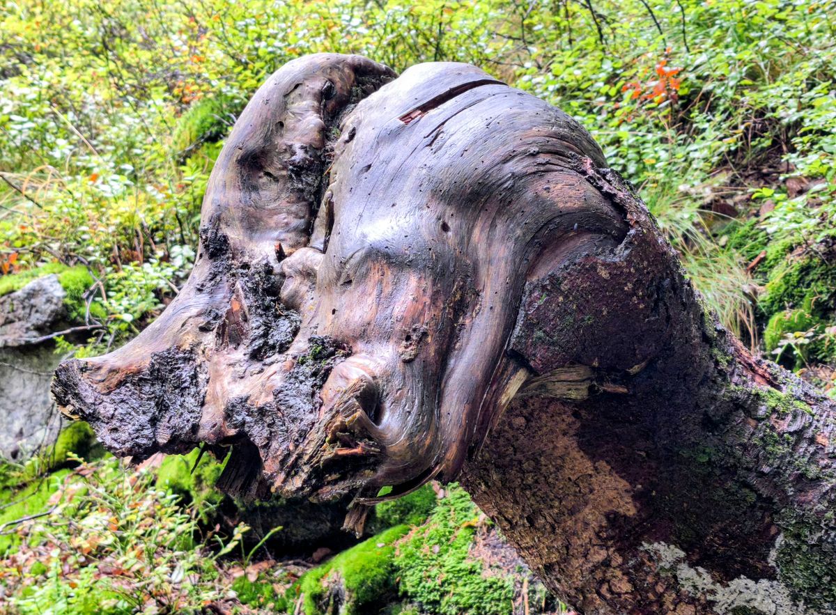 První zastávka, první lehce zamlžená panoramata. Déšť na chvíli ustává, aby se po pár minutách nad námi zase přehnal. Pozoruji průzračné dešťové kapičky, drobounké perličky, ulpívající na konci smrkových větviček. Idylku však brzy vystřídal prozaičtější, ač naprosto nepochopitelný nález: opuštěné, zahozené? turistické boty Columbia pečlivě uložené v červené igelitce. Záhadu necháváme za sebou.