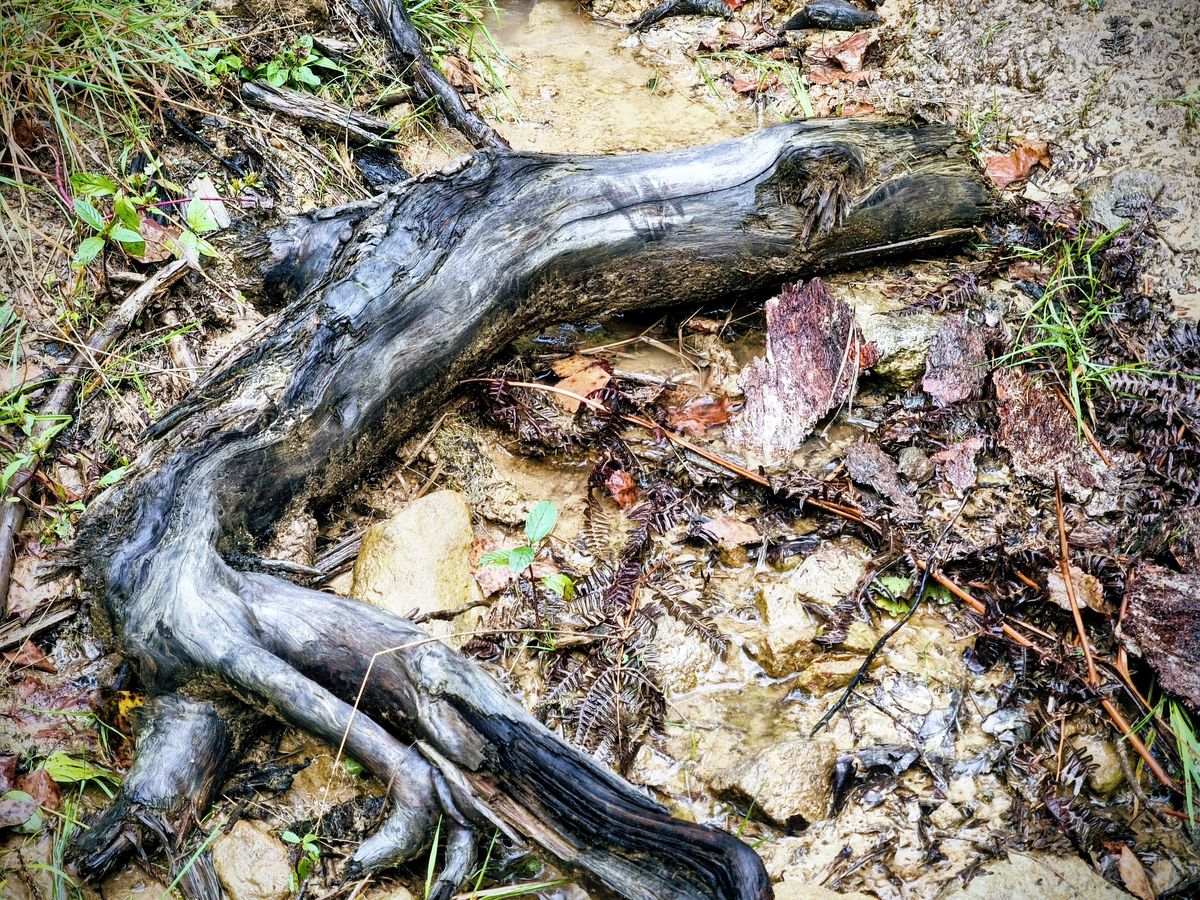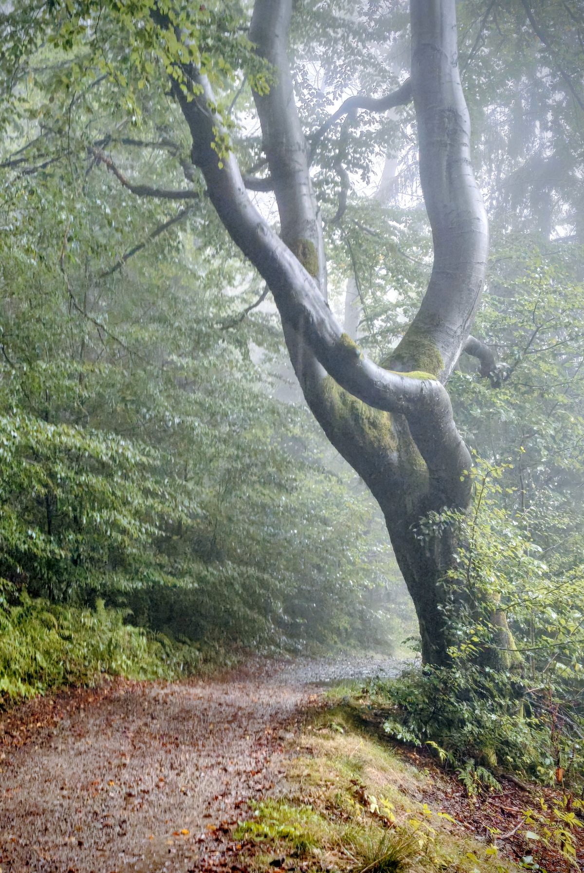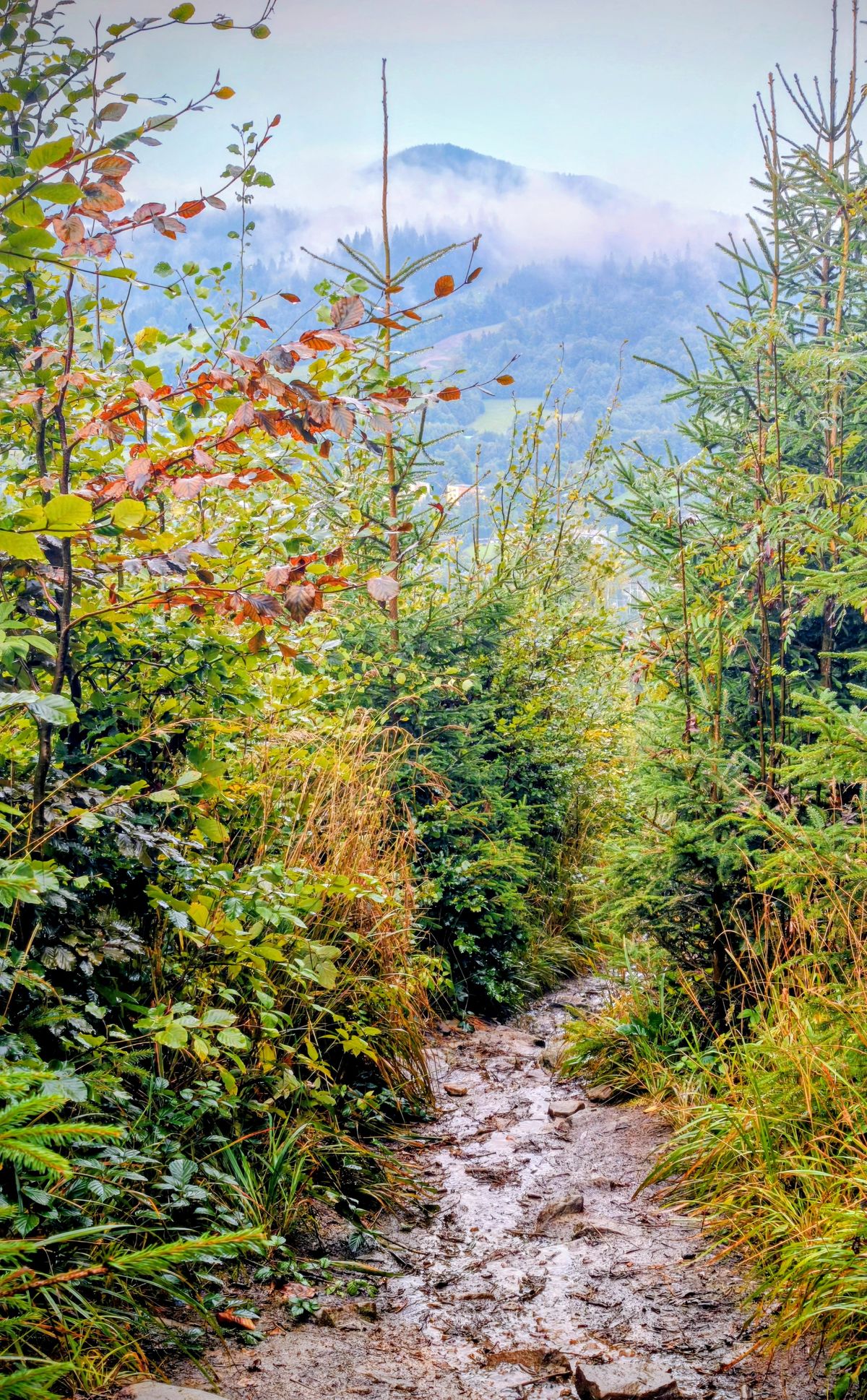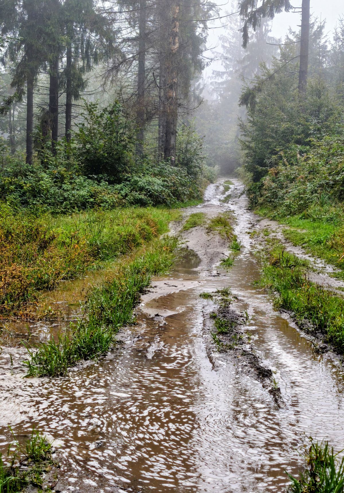 Oči přilepené k zemi, přecházíme přes kluzké kameny a kořeny. Občas zvednu oči z pod kapuce. Pokud můžeme, obcházíme blátivou cestu lesem, kde jdeme po jehličí, které nabízí alespoň iluzi bezpečnější cesty. Jakmile se ponořím do sebe, hned mi podklouznou nohy. Takže veškerá inspirace, která přichází, musí pryč a soustřeďuji se na cestu.