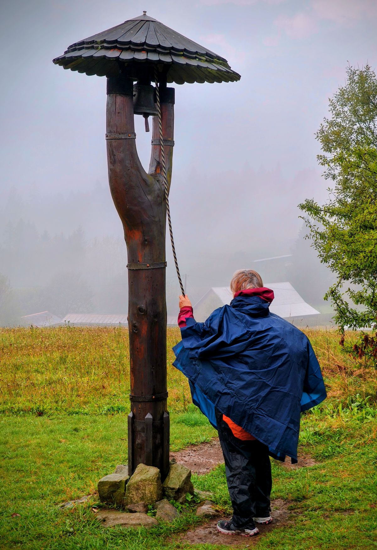 Zelená turistická nás přivádí k dřevěné zvoničce nad osadou. Zaklinkáme si a vysíláme přání šťastného putování.