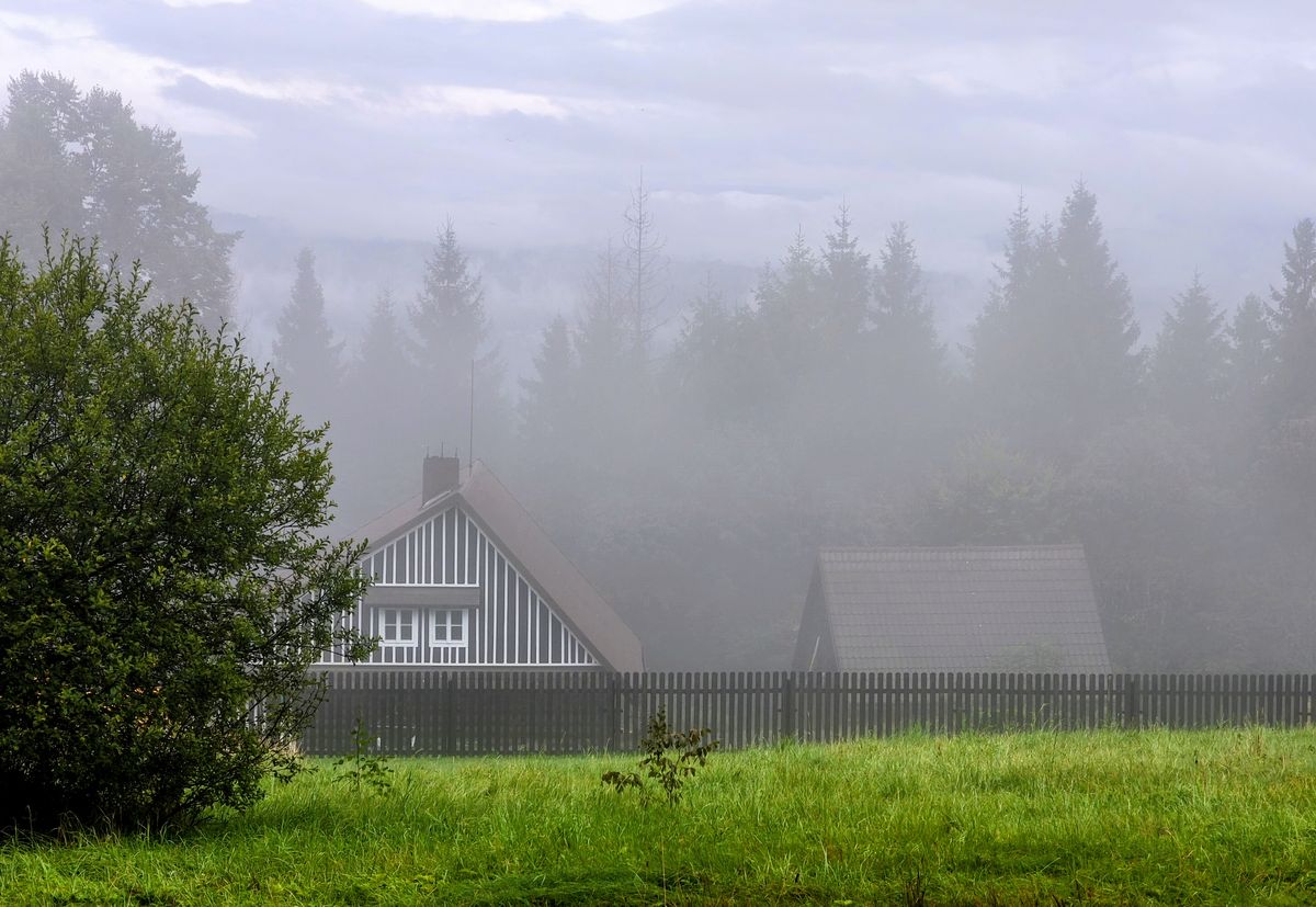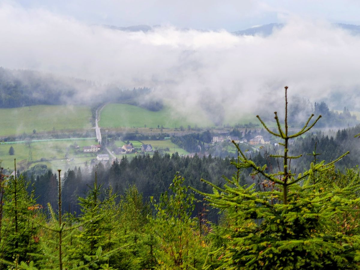 Před námi se rozprostírají, ač stále zamlžené, obrovské kopce poseté chaloupkami vypadajícími jako kostičky na hraní. Oddělené po celé šířce hor pásem vysokých štíhlých smrků.