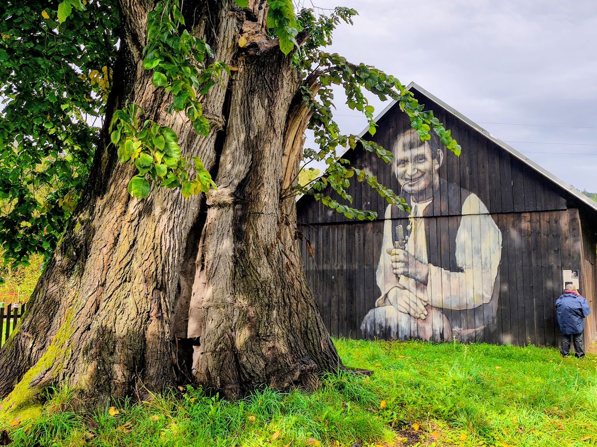 Přecházíme most z klád a v Bukovci zapádlujeme pod přístřešek. Krutě se rozpršelo. Naštěstí prudká přeháňka asi po deseti minutách ustává a my v lehkém deštíku pokračujeme dál. Z hlavní odbočujeme a u památného jilmu se na nás zdálky usmívá rolník, goral a bývalý starosta Adam Ćmiel, místními nazývaný Ujec od Waleczka.