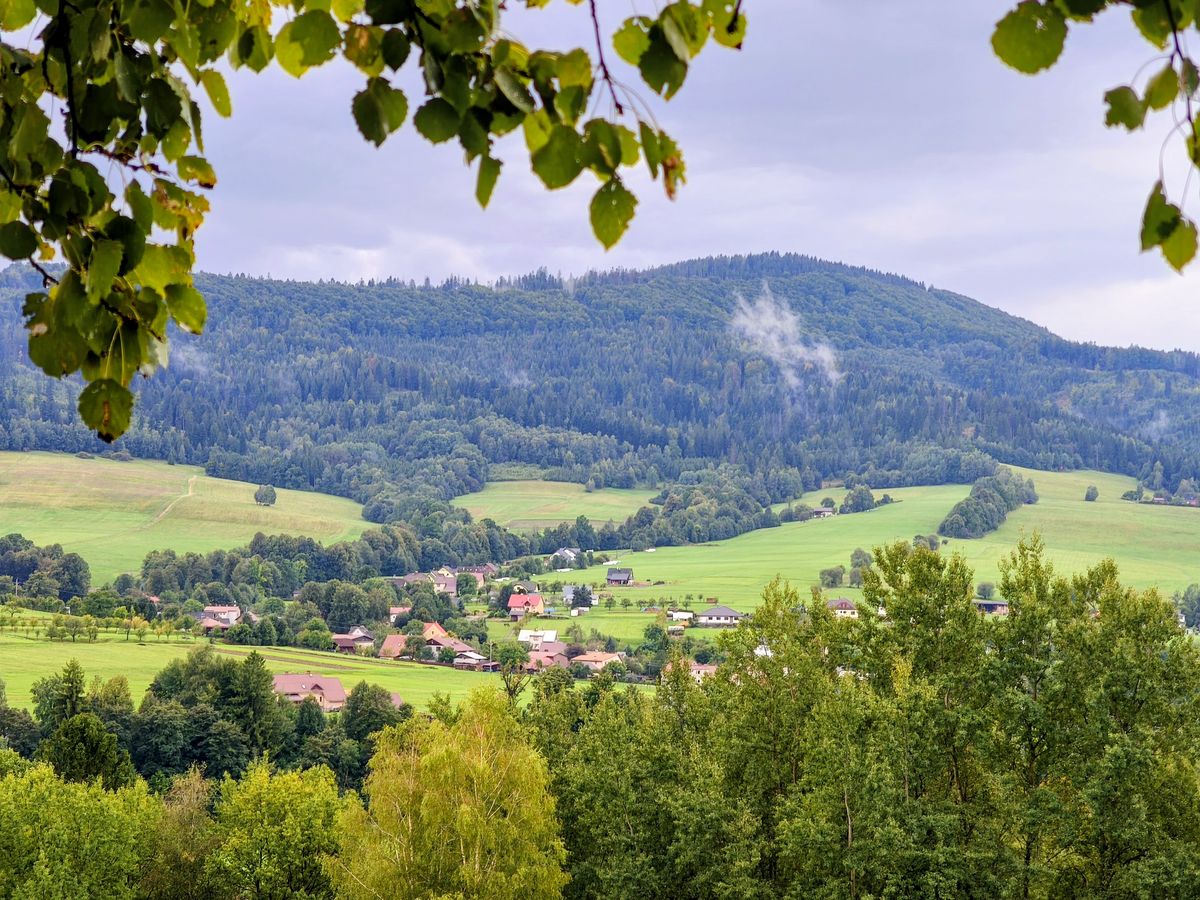 Za kempou 600 m n. m. Odsud se nám otevírají první výhledy na hraniční vrch Kyčera 989 m n. m. a další zalesněné kopce. Kravičky střídají chundelaté ovečky. Přeháňka se krátce přehnala nad krajinou a před námi se rozevřelo barevné Polsko. Pěšina se sedmi informačními tabulemi naučné stezky vede přes louku, vyšlapaný chodníček kopíruje okraj lesa při státní hranici a dovádí nás k potoku Oleška.