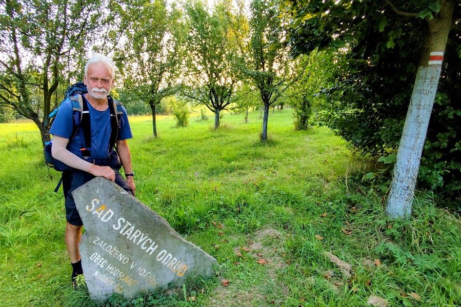 Jeden potok Bezejmenný a potkáváme další zvláštní název-Zadní potok. Uhýbáme po červené přes mostek a čteme ceduli: „Zákaz shromažďování osob. Maximální zatížitelnost 200 kg/m2.“ Riskneme to. Zastihuje nás telefonický dotaz ubytovatelky, potvrzujeme, že jsme na cestě. Přicházíme k Sadu starých odrůd. Co mě asi tak mohlo napadnout?