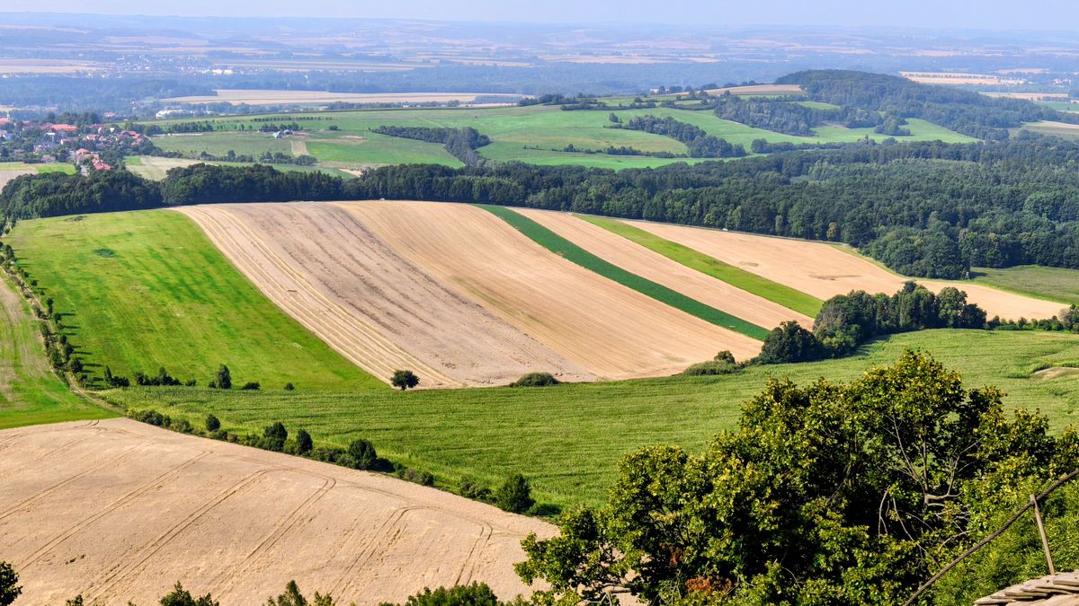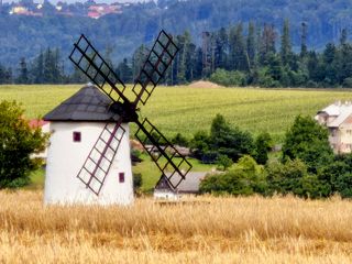 Ocitáme se u Malé vodní nádrže Starý Jičín. Dočítám se zajímavost, a to, že hráz o výšce 6,4 m a délce 265 metrů je vybavena bezpečnostním přelivem typu „kachního zobáku“, Tak si jen říkám, aby to neodnesla ta naše kachní regata. Procházíme pěknou příjemnou krajinou a žlutá nás vede alejkou do kopečka. Pro změnu třešinkovou. Překvapují mě zde zaparkovaná auta. Co nás nahoře asi čeká? Koukám na kombajny a manžel mi ukazuje čápy na poli. Jeden už vzal čáru, druhý tam pořád okukuje.