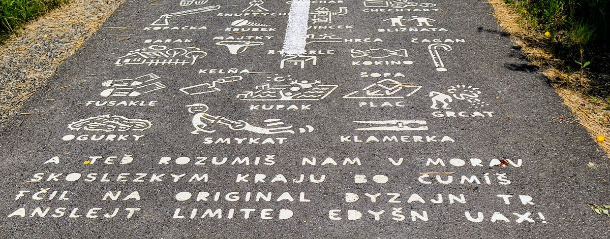 Olačka, špak, glajzy, lokálka, šrubek, cycky, ščur, chechtaky, plandaky… Byl to opravdu Moravskoslezský slovník na cyklostezce. Jeho autorem je Radek Leskovjan. Ve spolupráci s Moravskoslezským krajem a starosty místních obcí ozdobil stezku typickým nářečím.