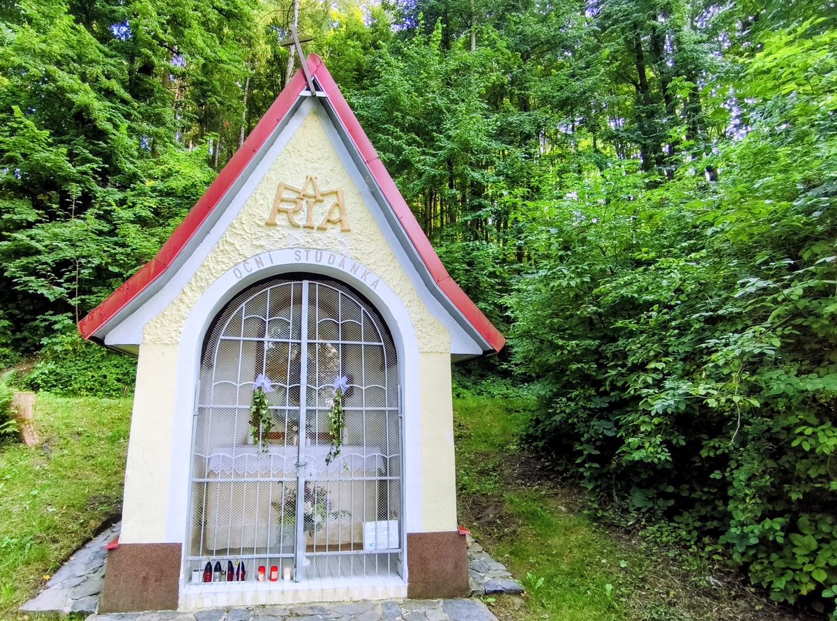 Staneme na poutním místě s kaplí a sochou Panny Marie Lurdské v objetí živých květin, ke které vede 31 kamenných schodů. Objevujeme Oční studánku. Hned si protírám oči ze všech světových stran. Proč? Existuje spousta legend, kdy silně vápenitá voda pramene údajně uzdravila spoustě lidem oči, když si je v její vodě smočili. Denně si sem pro vodu jezdí mnoho lidí, proto možná ta auta dole. Každoročně první neděli v srpnu se tu konají mše svaté při příležitosti zahájení poutního období na Starém Jičíně. A na slavnost sv. Václava, jenž je patronem Starého Jičína, se z tohoto místa zahajuje tradiční Svatováclavský běh.