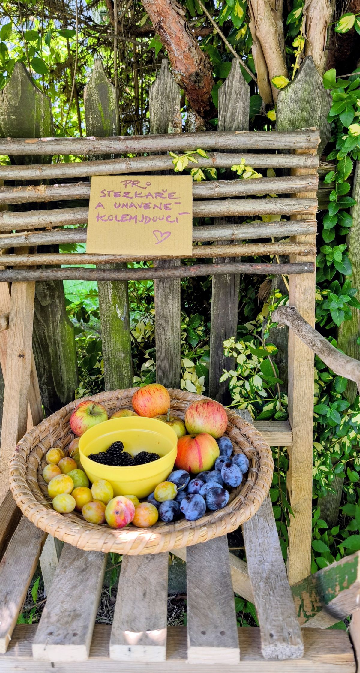 Místní nás s úsměvem zdraví. Pár minut po tom, co mi proletí hlavou, že jsou místní dobře naladěni na poutníky, neuvěříte. Před plotem dřevěná originální židle, na ní ošatka s ovocem a nápisem: „Pro Stezkaře a unavené kolemjdoucí.“ Jste úžasní, Bernartice č.p. 52. Děkujeme ❤️
