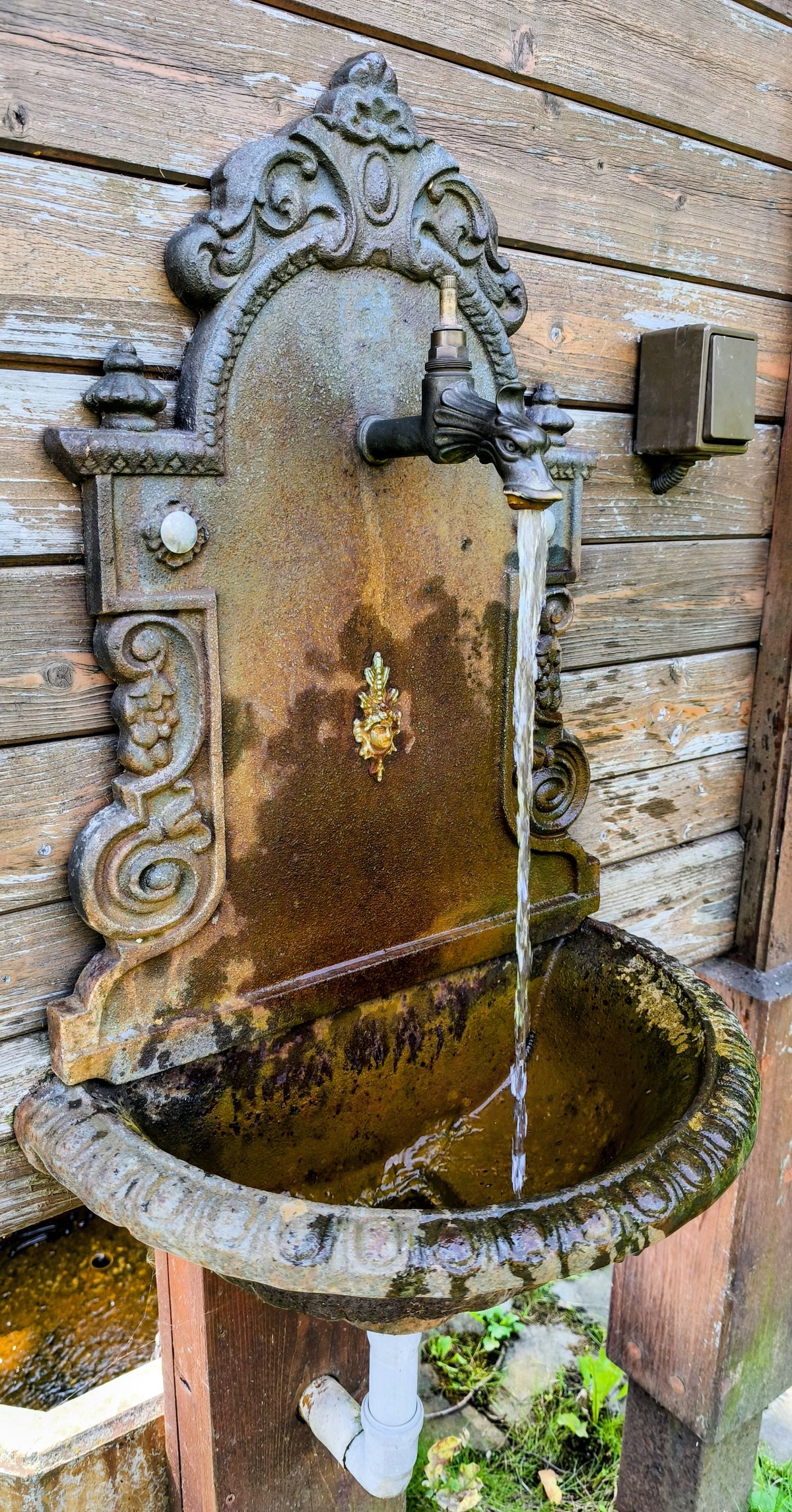 Přecházíme koleje a na chodníku jsem se sesunula jako oplatka z tající zmrzliny. Nějak jsem špatně šlápla. Trpalka, nó. Odměnou mi budiž krásný čep Jesenické kyselky o pár kroků dále. Opravdu jenom chvíli jsme hledali u krásného prameníku kohoutek, než jsme si všimli puntíku. A druhá kyselka funguje pro změnu na klasický vypínač. Ochutnáváme a doléváme tekoucí zdraví.