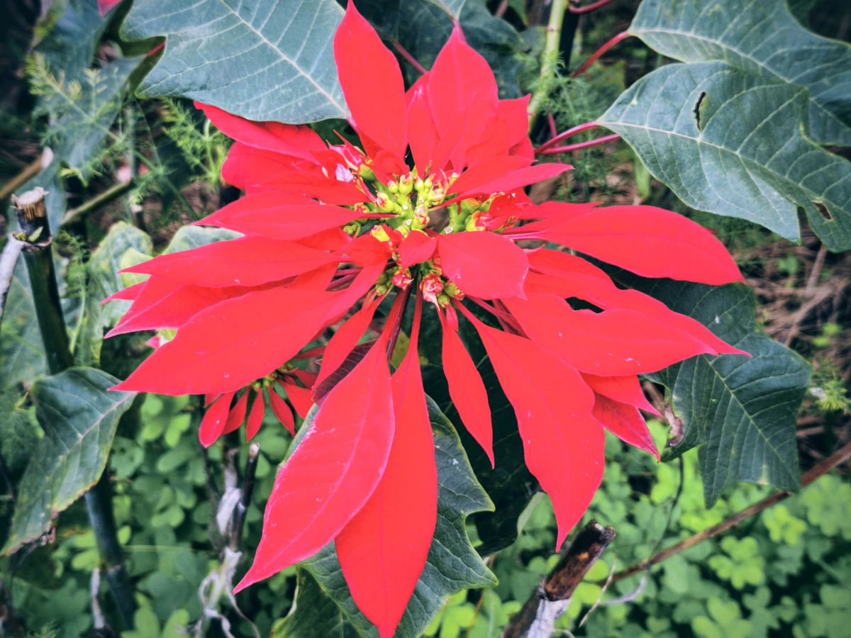 Dotek vánočního kouzla. To, co vypadá jako velké červené okvětní lístky, jsou ve skutečnosti barevné listy. Samotné květy jsou ty drobné žluté kuličky uprostřed.