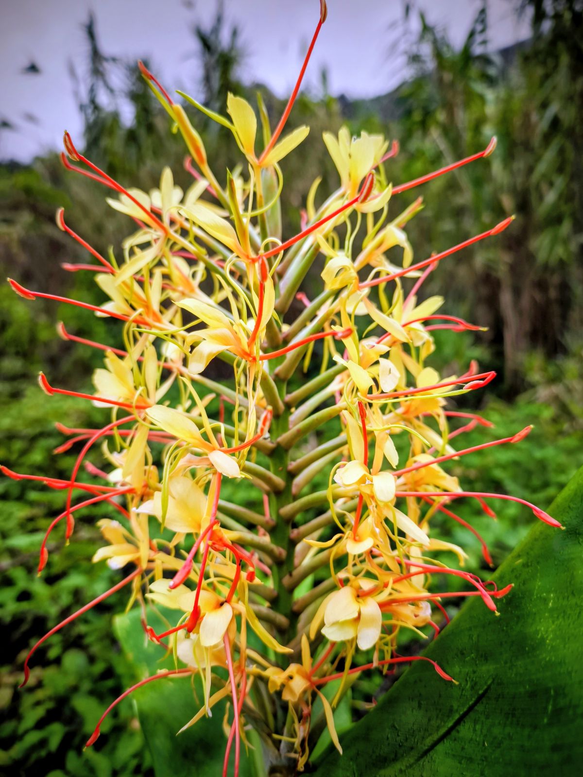 Kráčíme po kamenném chodníku a takto se nám to střídá za pomoci barevných pohledů na spoustu květin až nahoru. Nevěřím svým očím — „naše“ lichořeřišnice ale hned za ní banánovník s obrovským pevným trsem žlutozelených banánů.