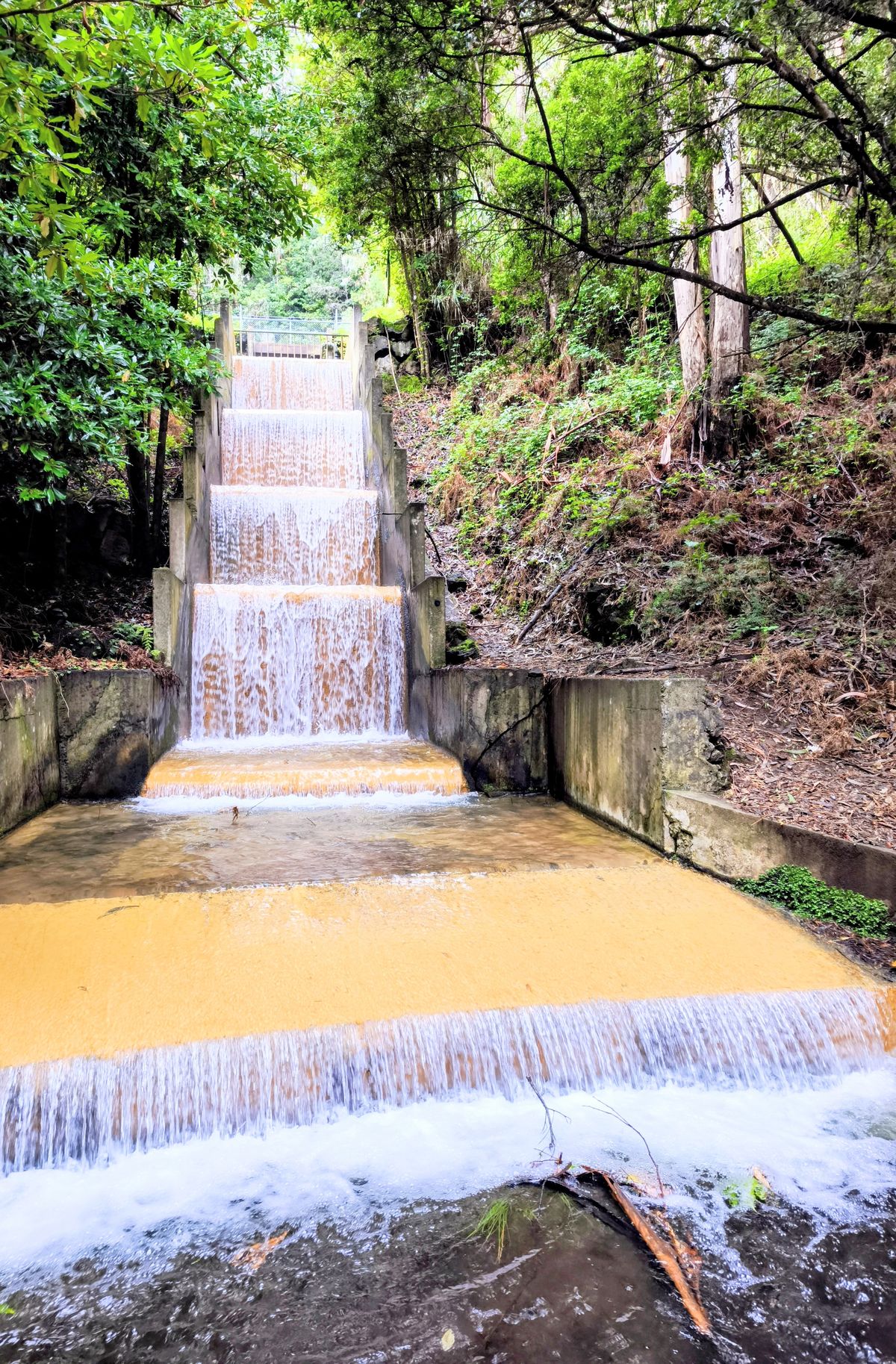 Přicházíme ke kaskádovitému vodopádu a prvnímu tunelu. Nasazujeme čelovky. Po relativně krátkém tunelu procházíme opět podél historického zavlažovacího kanálu lemovaném na jedné straně skalními stěnami s občasnými jemně ševelícími sprškami.