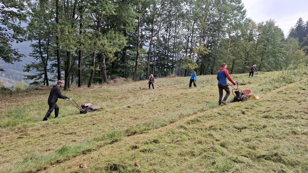 Na louce v Ostravici to žilo. Sekání trávy i úprava svahů – dobrovolníci tu připravili terén, aby se tulákům po horách šlapalo jedna báseň.