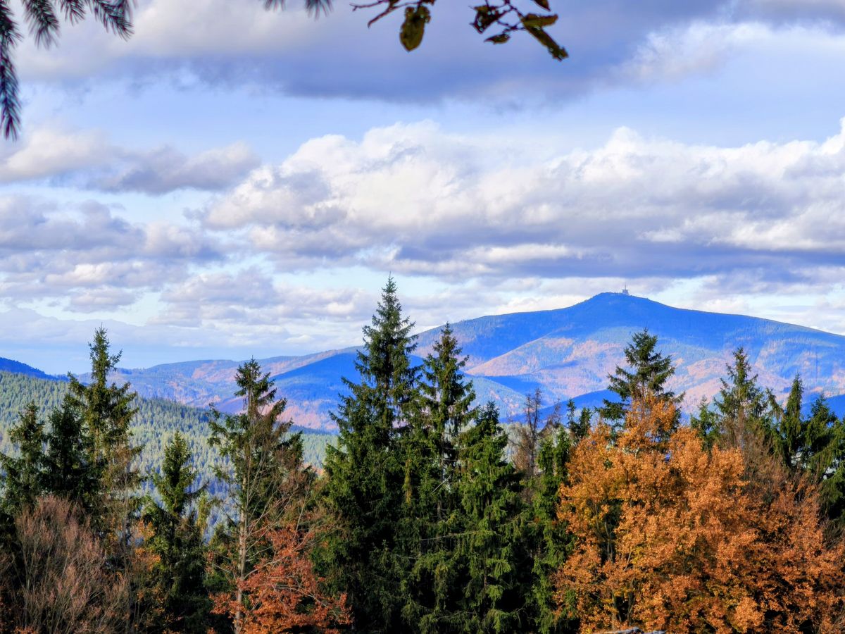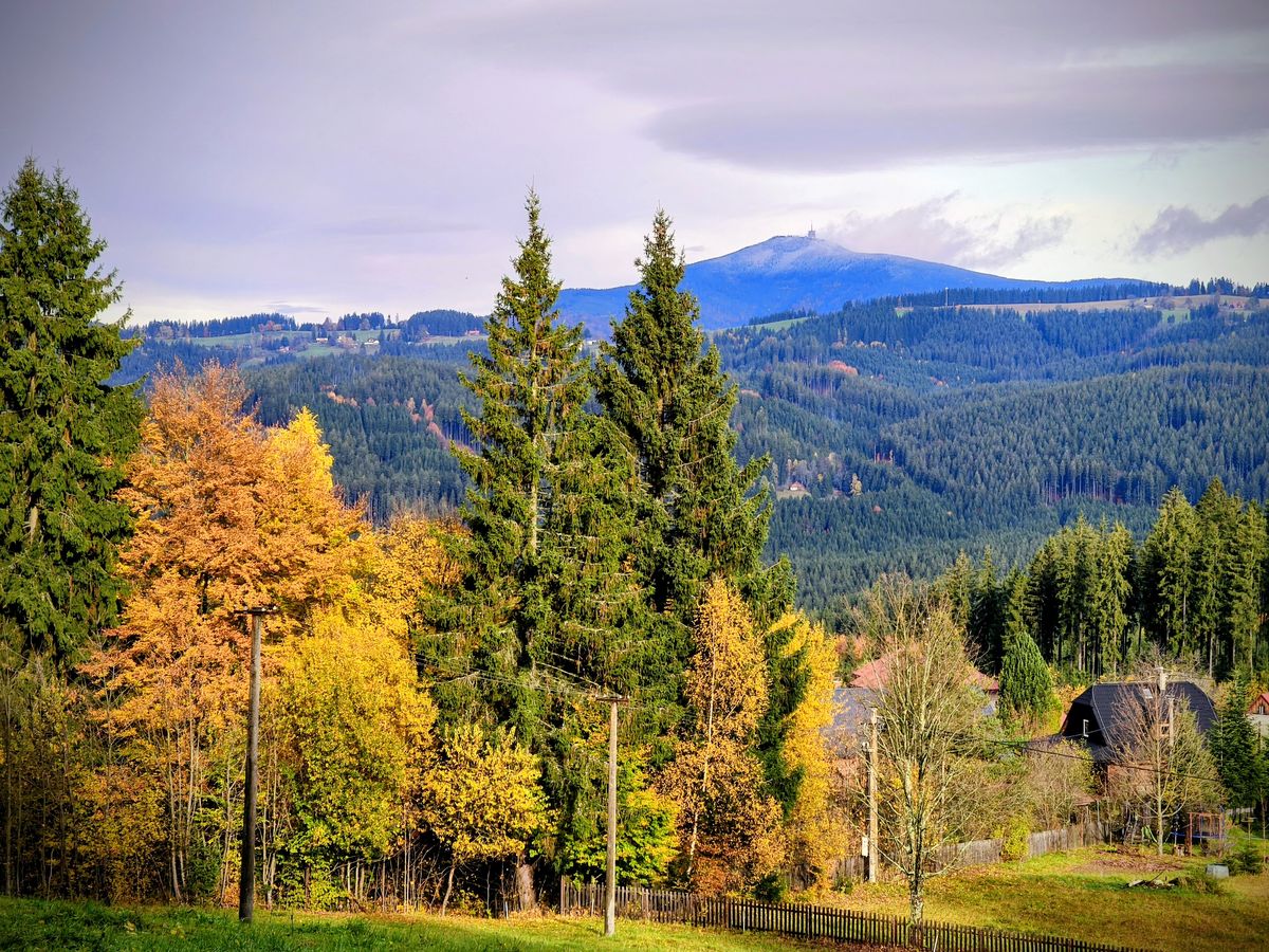 Stromy se rozestoupily a nabídly barevný výhled na Lysou horu. S oblaky jako vymalovanými. Nádhera.