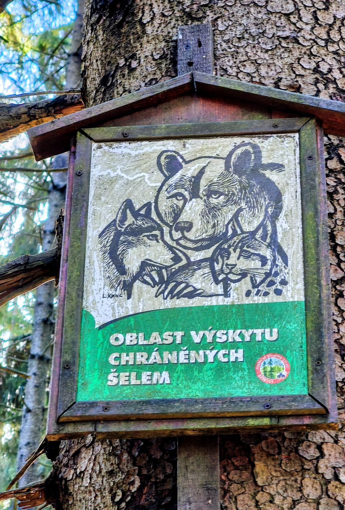 Cedule s nápisem: Oblast výskytu chráněných šelem