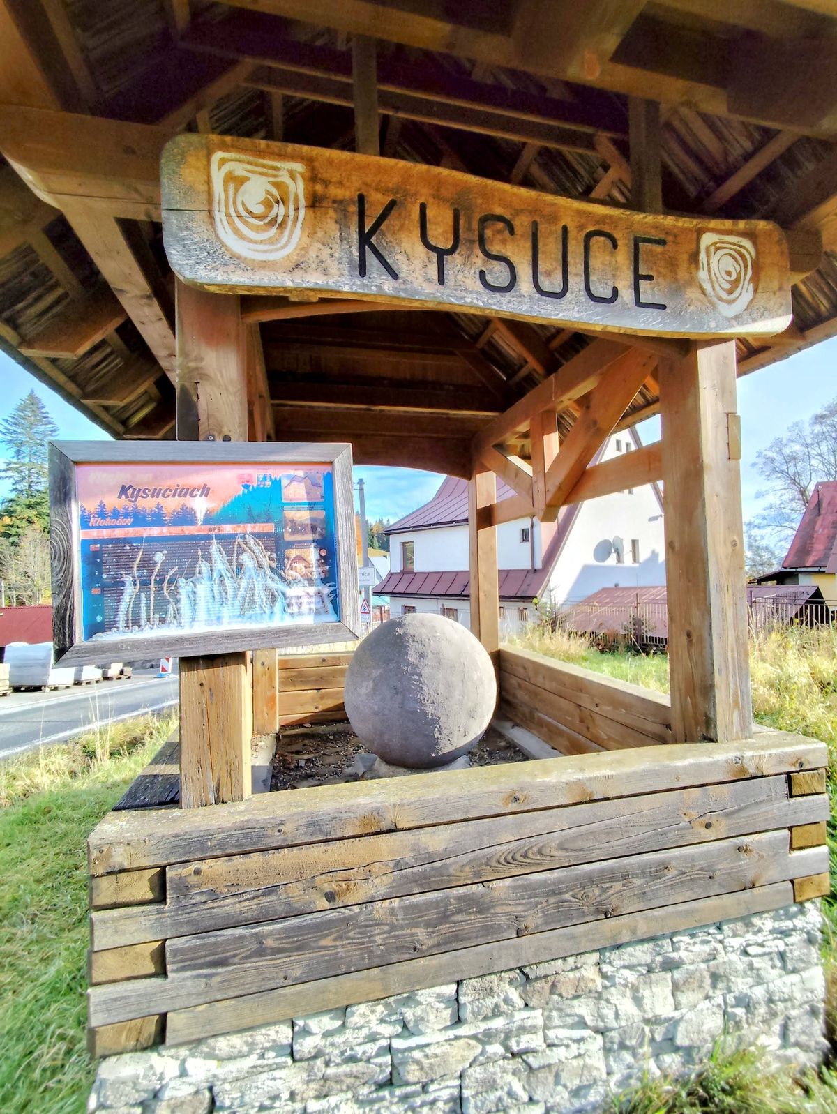 Nebe se přebarvilo do šmolkově modré, přes kterou plují šediví bubřáci. Bumbálka 860 m n. m. a téměř u rozcestníku na křižovatce pod stříškou si lebedí další kulatá kamenná krasavice z Kysuc.