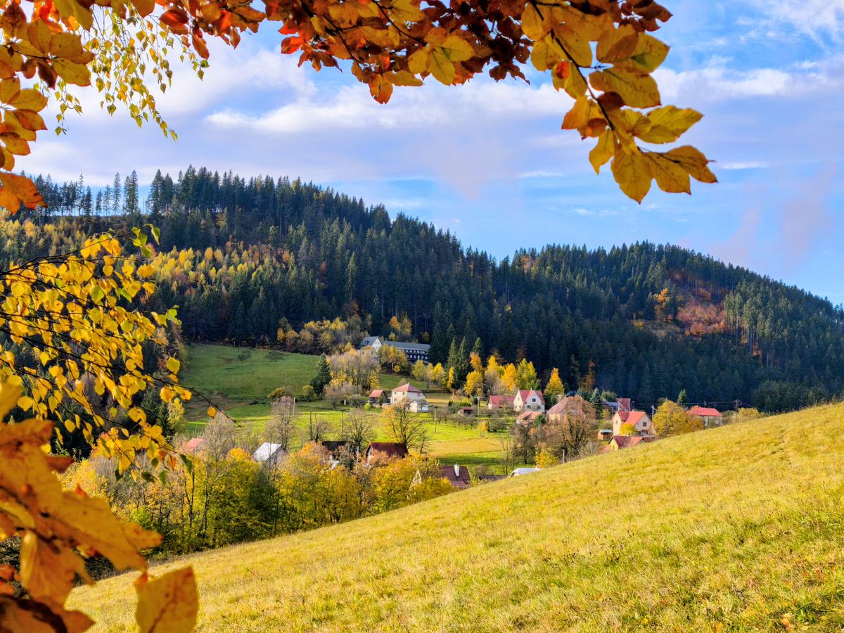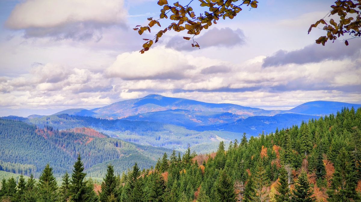 Podzimní mozaika rozehrává kouzla všech barev. Zářivě žlutá, svítivě oranžová, okrová. Temně hnědá se mračí v houští stromů. V dáli barvy lehce probleskují zelení. A na obzoru to vypadá, jako by Pán vzal tlustou bílou pastelku a přečáral modré vršky kopečků.