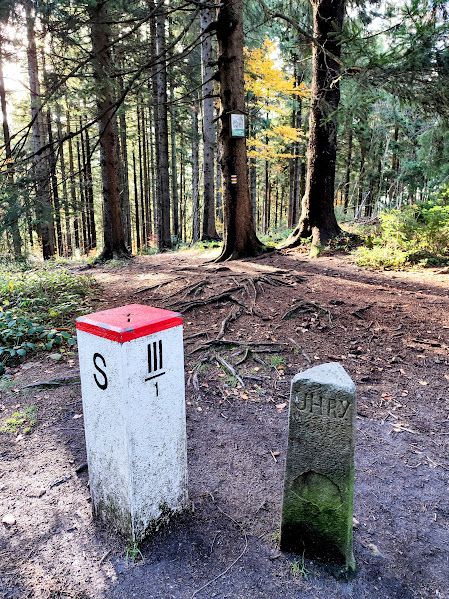 Hraniční kameny potkáváme snad po padesáti metrech. Zrovna jeden, s červeným kloboučkem, vykukuje na vršku. Hraniční mezníky jako muchomůrky. Jen jim na ty červené čepičky napinkat bílé tečky.