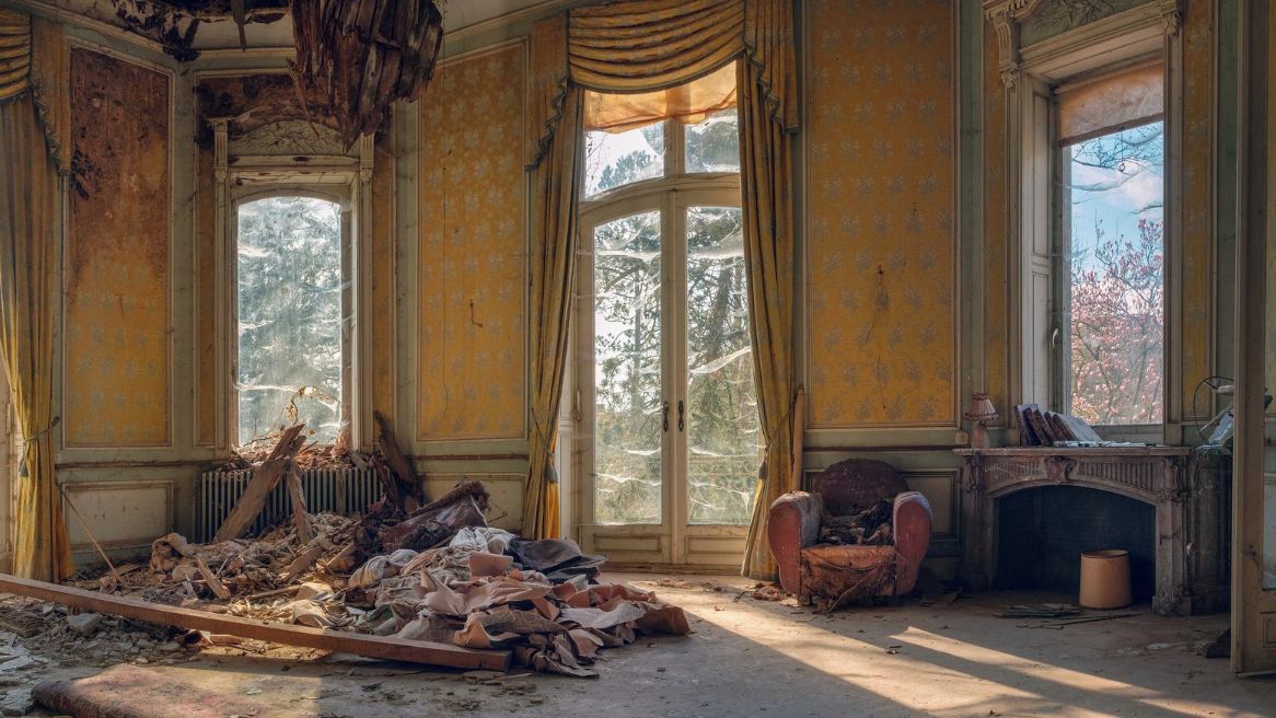 Okna byla zabedněná zevnitř deskami, takže i přes den tam bylo šero. Když jsme jednu desku odsunuli, ukázalo se, že sklo je rozbité a díra zalepená kartonem. Po stěnách tekly tmavé mapy vlhkosti. Na dotek byly mokré.
