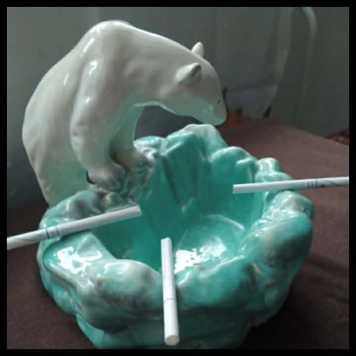 „Byly doby, kdy různá vetešnictví měla na skladě i deset takových keramických medvědů. Situace se však změnila, když jistého zahraničního podnikavce napadlo vyvézt popelníky s medvědem do Spojených států. Tam je začal nabízet jako typický český keramický artefakt z meziválečného období. Postupně popelníky vzaly do své nabídky téměř všechny aukční agentury a cena českého ledního medvěda stoupala. Dokonce se několikrát přehoupla i přes 500 dolarů, a to byl tehdy dolar za 35 korun. Do Česka se proto vydalo mnoho dalších podnikavců, aby také zakoupili dobře prodejný artefakt. Zákony trhu však platí neustále. Čím více ledních medvědů, tím nižší cena. Dnes už se asi žádný překupník nebude tahat s 20 centimetrů vysokým popelníkem na druhý konec světa.“