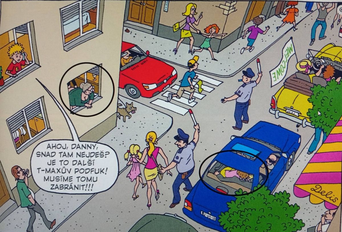 V tomto dvojčísle, které vyšlo na podzim roku 2015 nazvaném Mistři převleků, autor mistrně ukryl dvě malůvky, které se dají vysvětlit různě. Jedná se o postarší paní vykloněnou z okna za níž jsou naznačeny dvě ruce a celek tak může působit, jak by řekla Konopníková z filmu Slunce, seno a pár facek: „To vypadá jako když.“ Zezadu. O kousek níže je druhý výjev v autě, kde paní leží pánovi s hlavou v klíně.