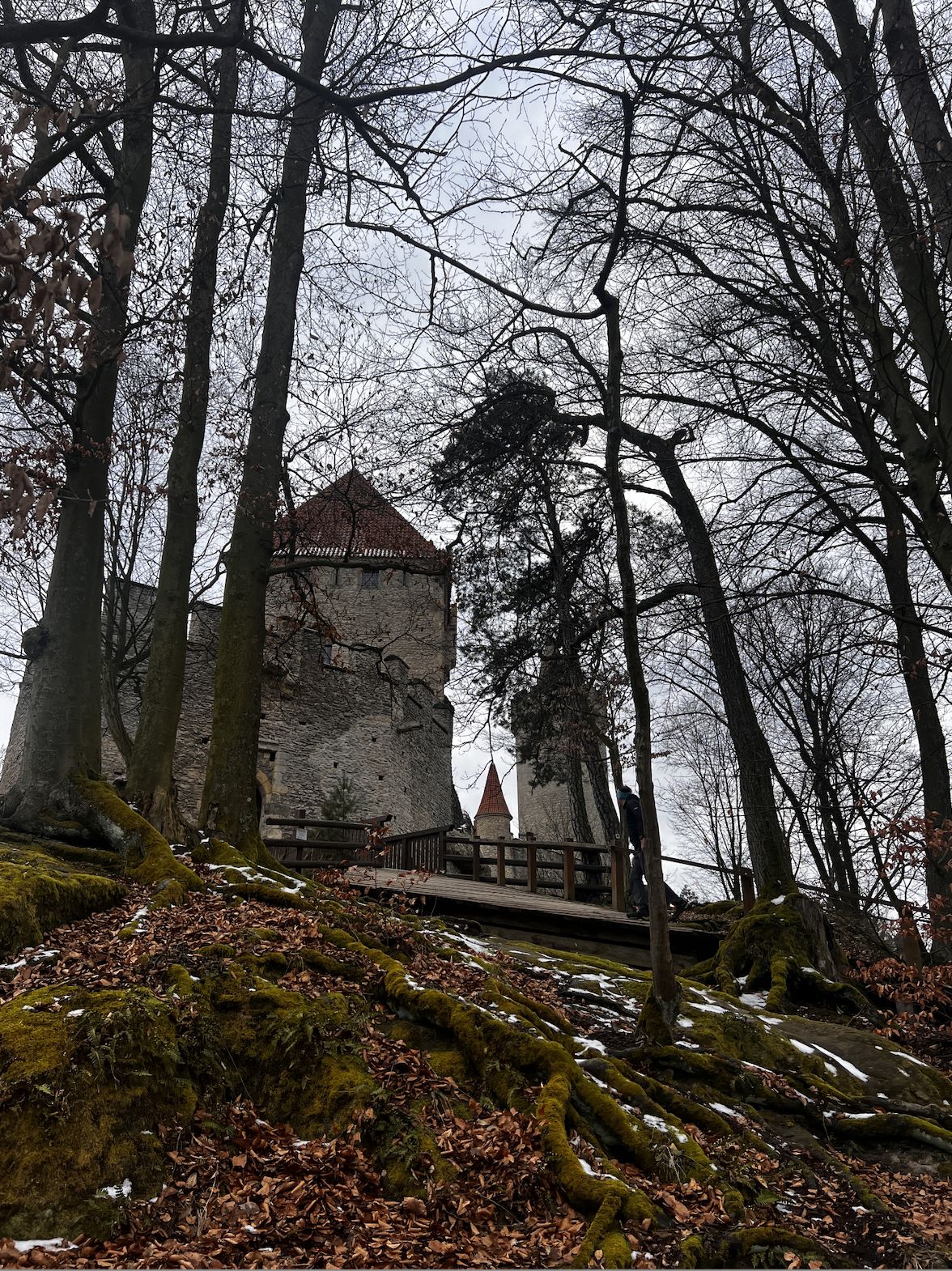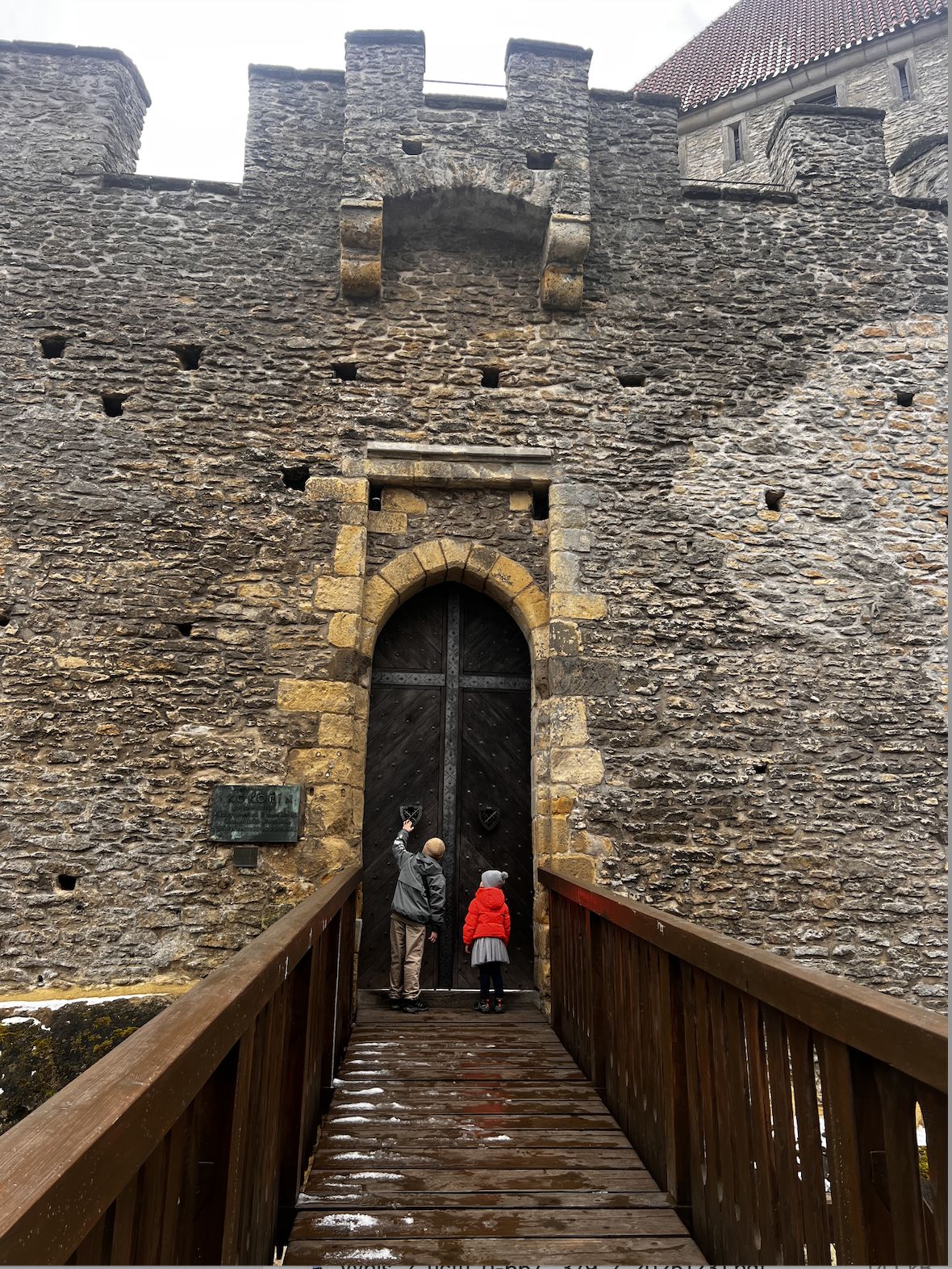 Hodinka podél potoka, pak schody nahoru k hradu. Čekali jsme vzpouru – nepřišla. Matěj se před kamarádem zjevně styděl brečet a Amálku kopce kupodivu baví. Nadává až při sestupech. To mají s matkou dost podobné.