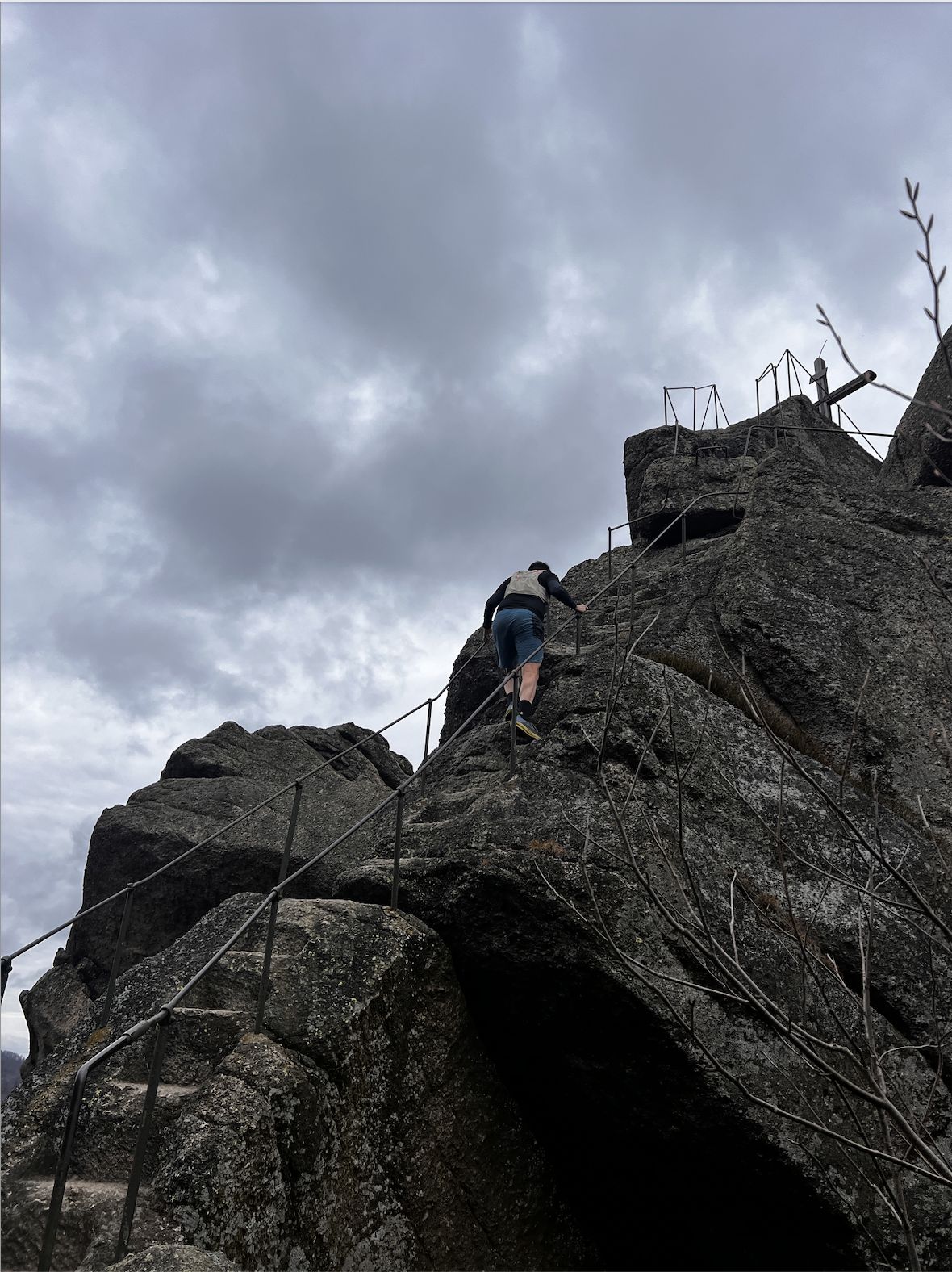 Pod Ořešníkem matka posměšně poptávala, kde že se to otec při nočním běhu tak bál lézt. Cestička nahoru je strmá, jištěná tenkým kovovým zábradlím. Pro lidi s panickým strachem z výšek nic moc.