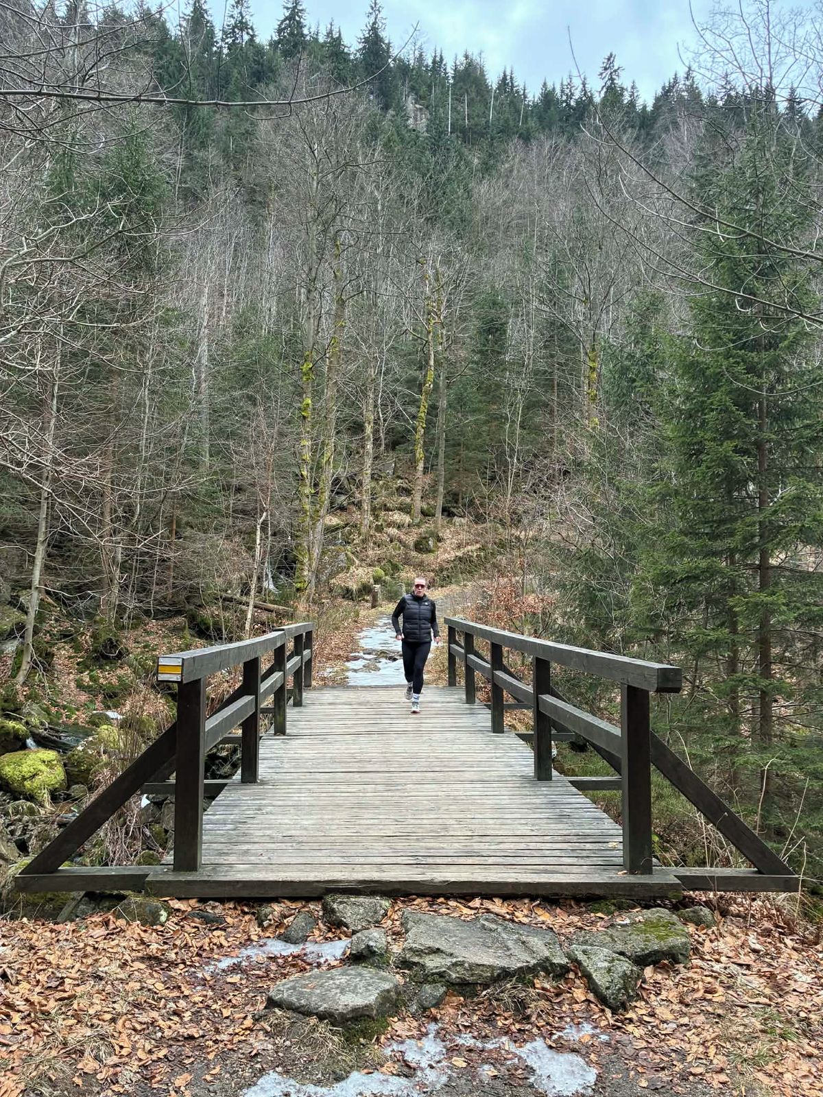Vodopád Velký Štolpich byl díky tajícímu sněhu ve skvělé formě. Zespoda je fotogenický – matka se vyřádila s focením. Na mostek nad ním vede nečekaně ostré stoupání, ale výhled shora je spíš kulisový.